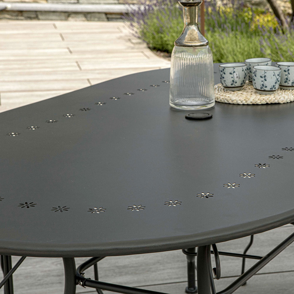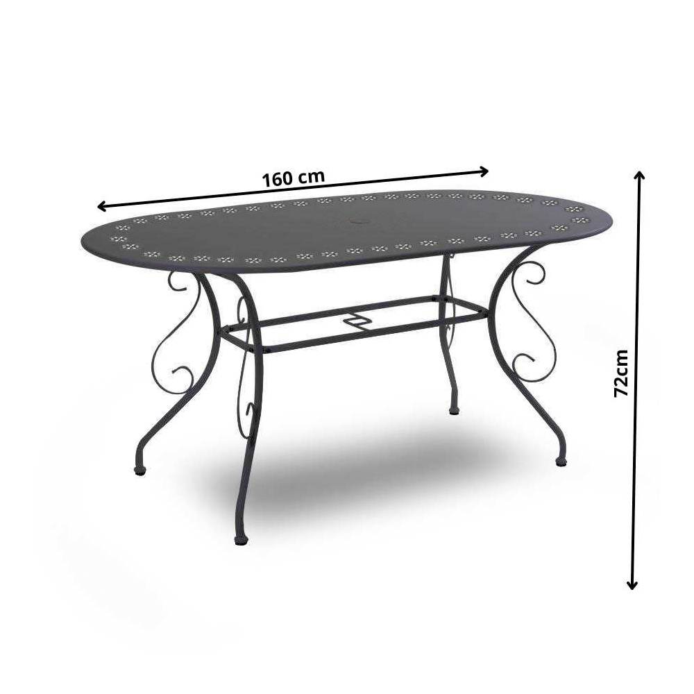 Questo tavolo ovale in metallo è una scelta perfetta per chi ama unire praticità e stile. Con la sua struttura robusta e le gambe eleganti e ricurve, offre un punto d'incontro ideale per momenti conviviali all'aperto.