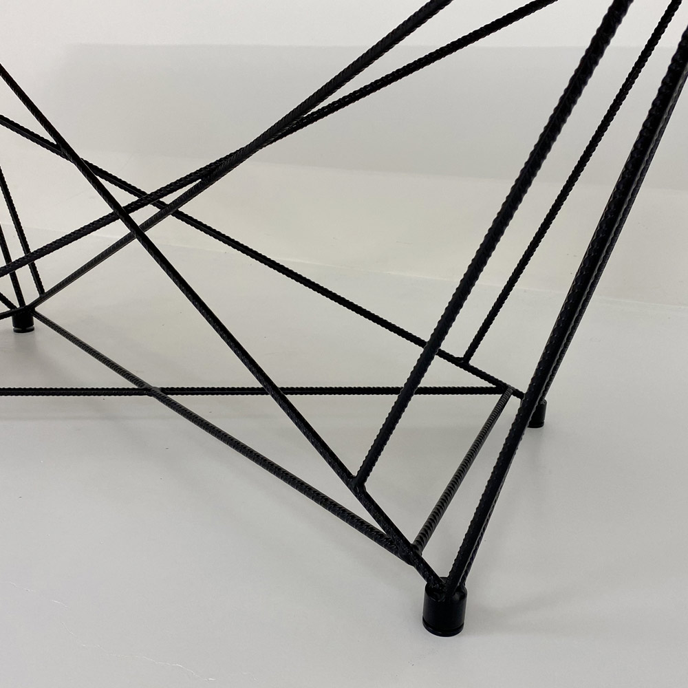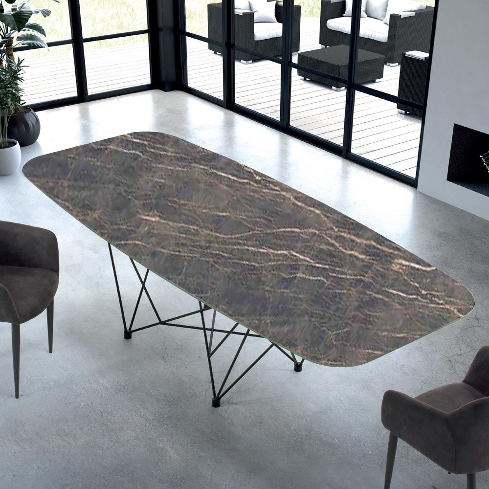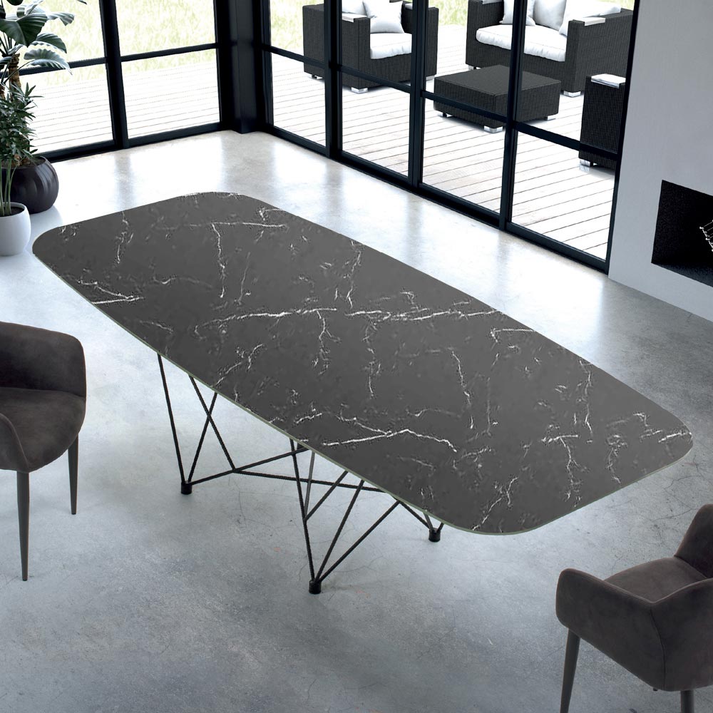 Tavolo a forma di botte con piano in Ceramica e base in acciaio nero prodotto in Italia.