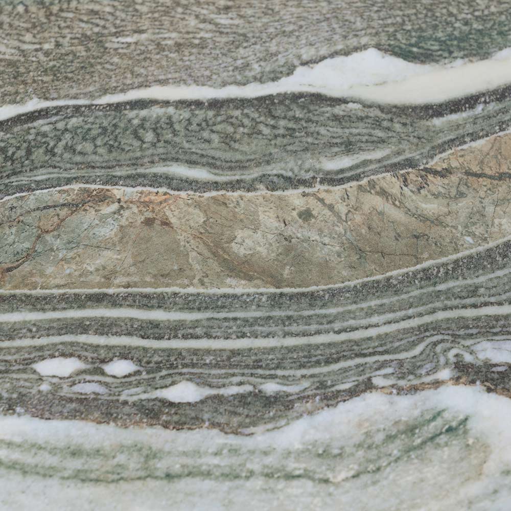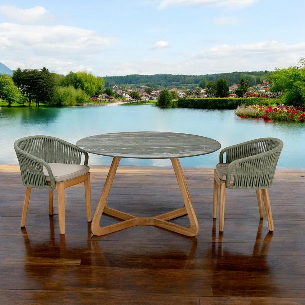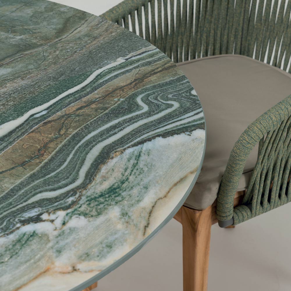 esterni. Il tavolo, con il suo piano rotondo in ceramica, richiama le onde serene di un lago alpino, offrendo non solo una superficie pratica ma anche un vero e proprio elemento di conversazione. La base in legno conferisce una