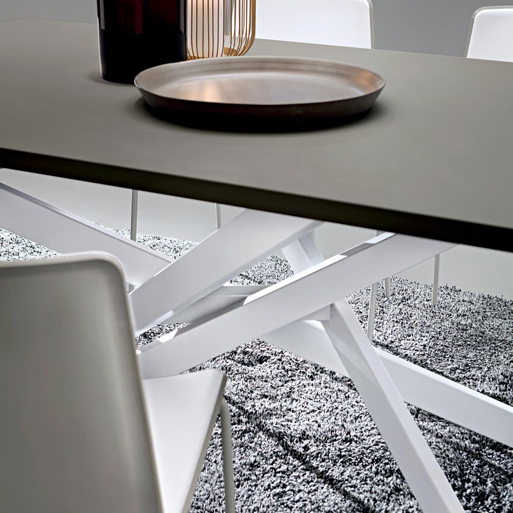 semplice e versatile il cui design viene arricchito e reso unico dalla particolare conformazione delle gambe che, grazie all'inusuale forma intrecciata, donano al tavolo la sua vera
