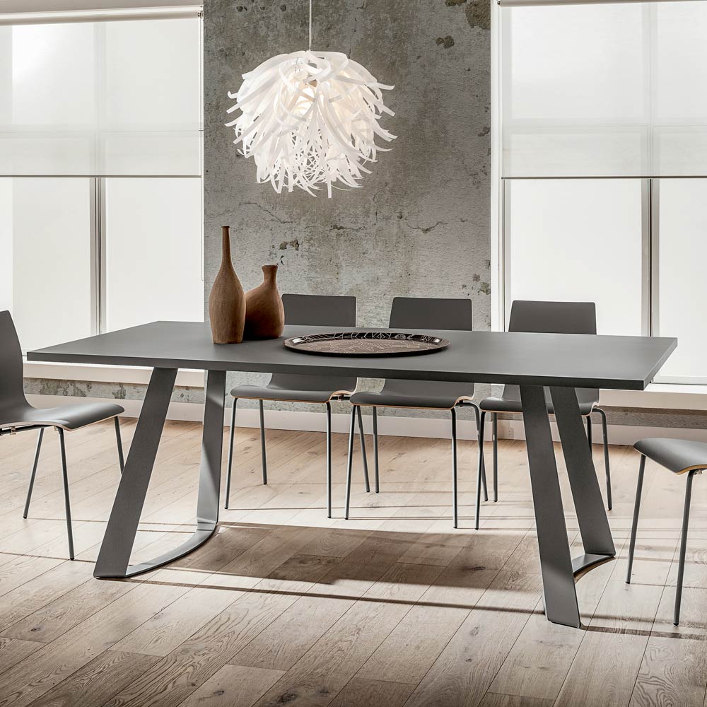 metallo verniciato a polveri epossidiche in tinta col piano. Ideale per completare ambienti dallo stile estremamente moderno questo complemento dalle linee semplici e minimali è caratterizzato dalla particolare conformazione delle gambe le quali offrono al tavolo uno stile ancor più originale e ricercato e danno vita ad una