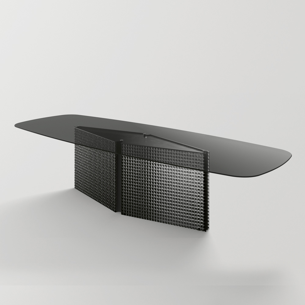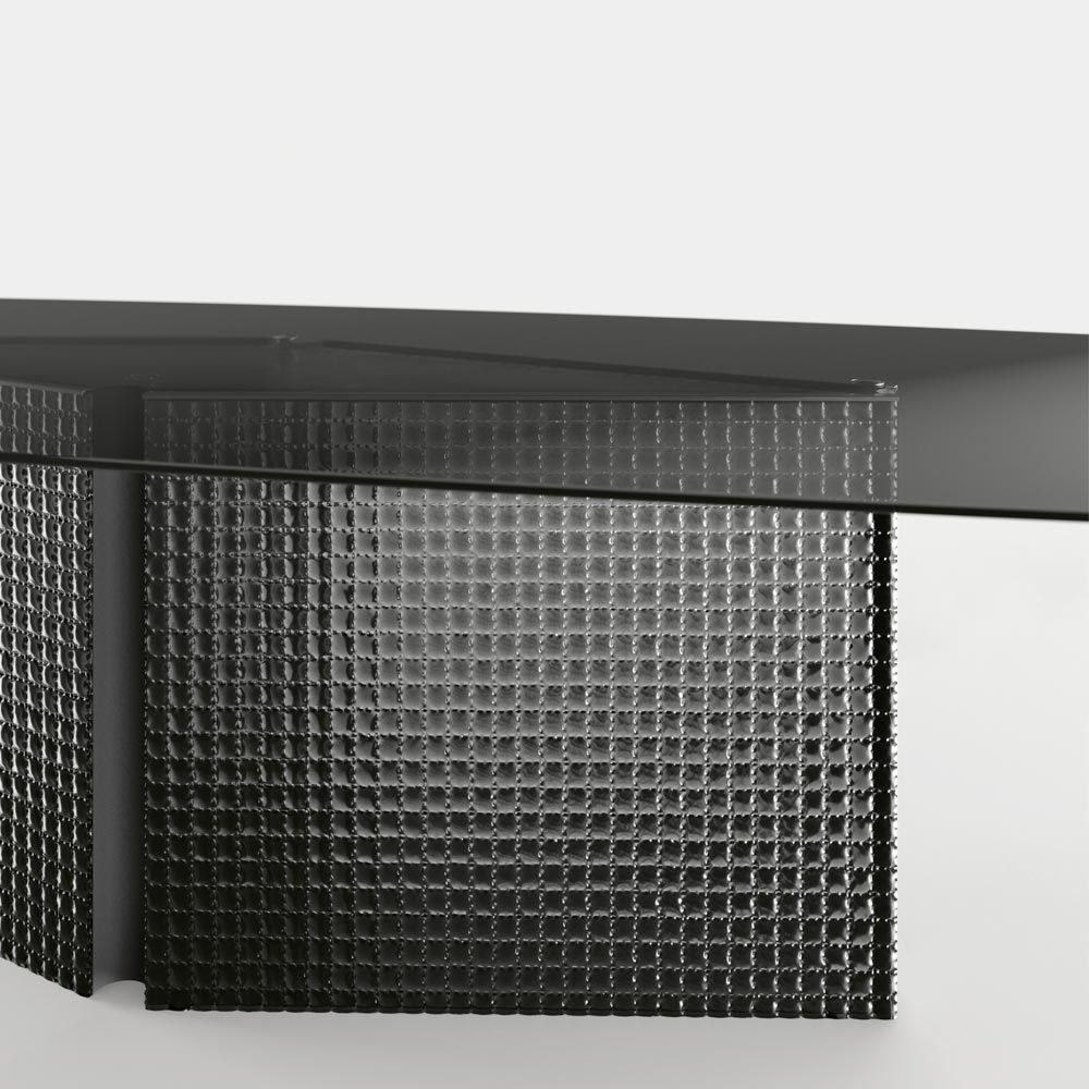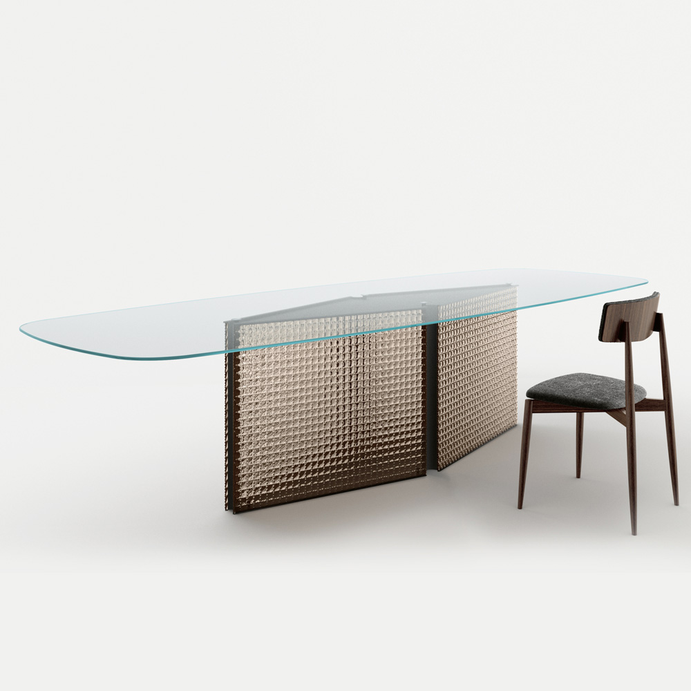 Tavolo in vetro temperato sagomato e base in vetro fuso