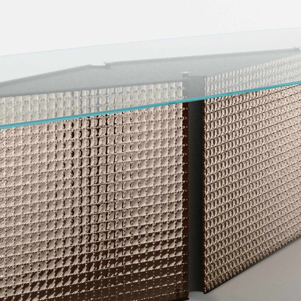 vetro temperato sagomato fissato alla base tramite piastre di acciaio e basamento centrale composto da elementi in