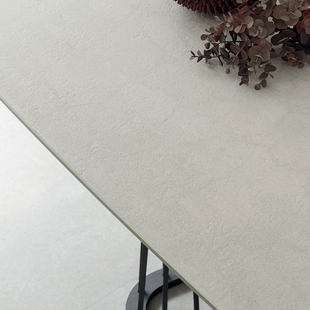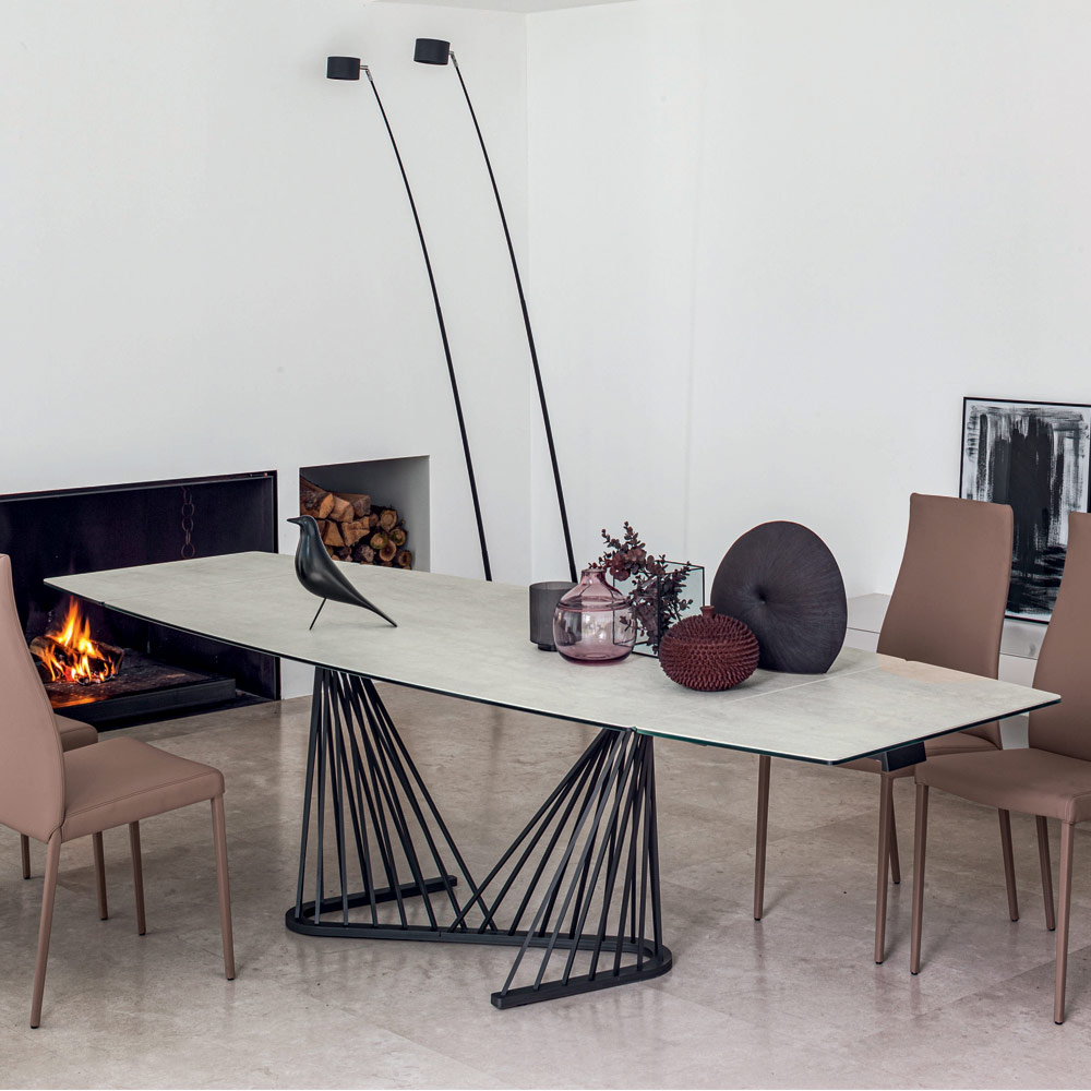 Tavolo da pranzo allungabile in ceramica e base con corde in metallo made in Italy.