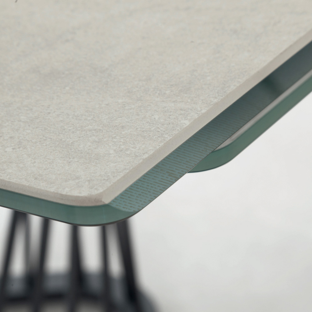 piano sagomato a botte in ceramica opaca su vetro con allunghe riposte sottopiano e telaio allungabile