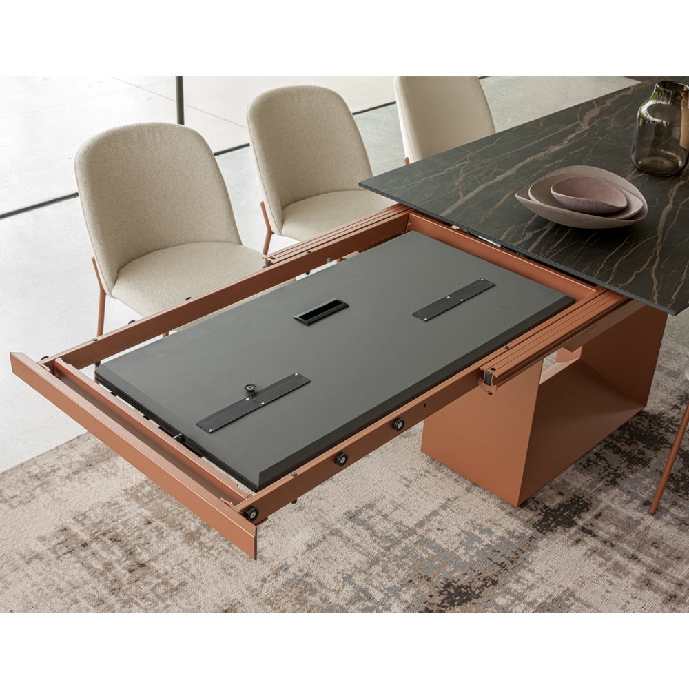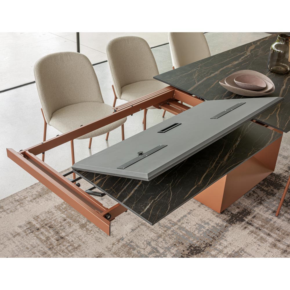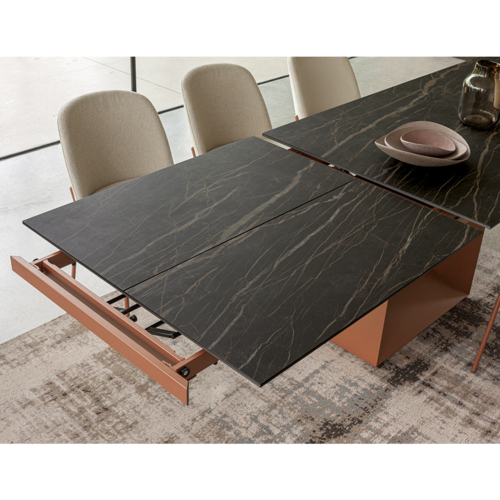 Tavolo da soggiorno realizzato con piano in ceramica, base e struttura allungabile in metallo, meccanismo telescopico e apertura sincronizzata a libro con prolunga interna in ceramica con continuità di vena, interamente Made in Italy.