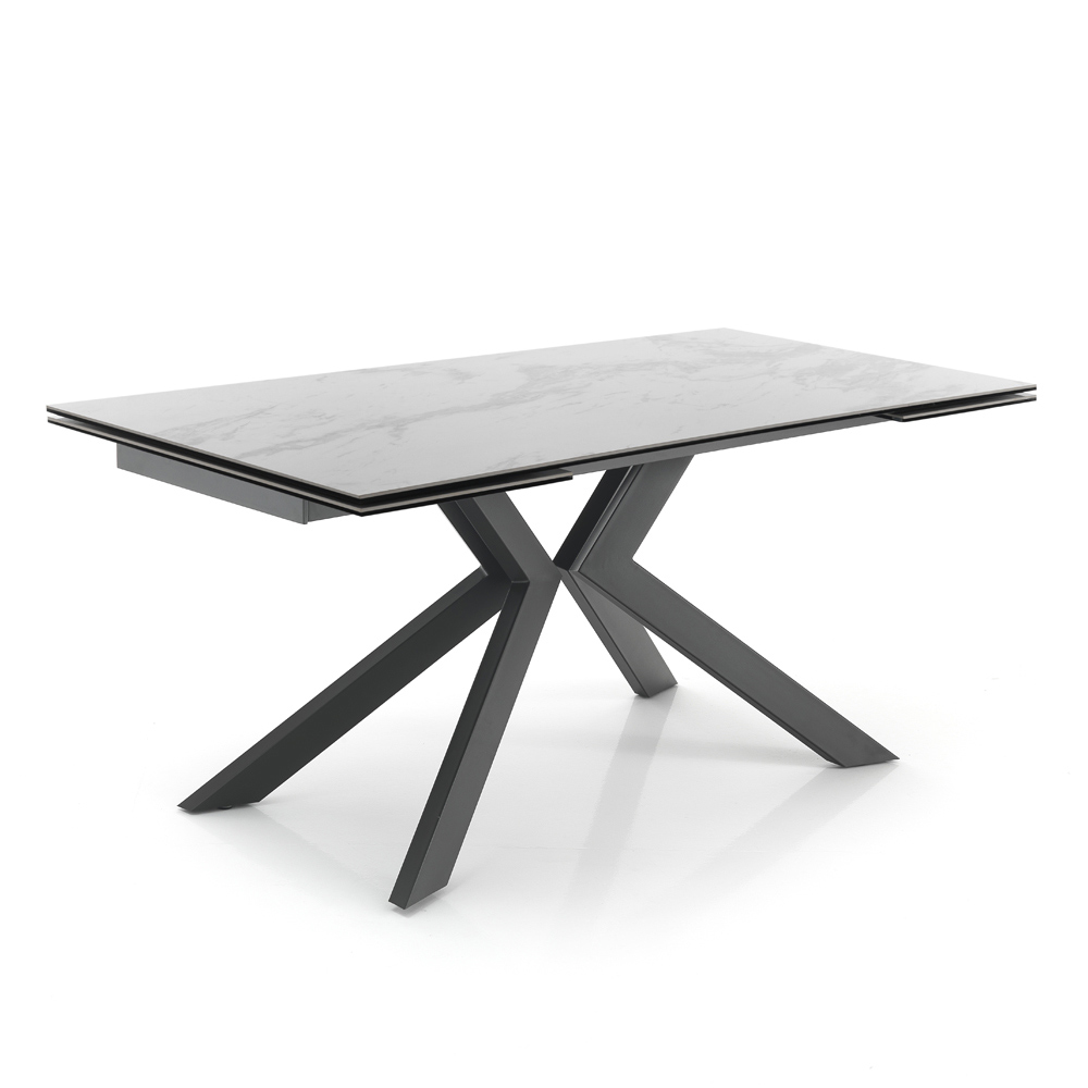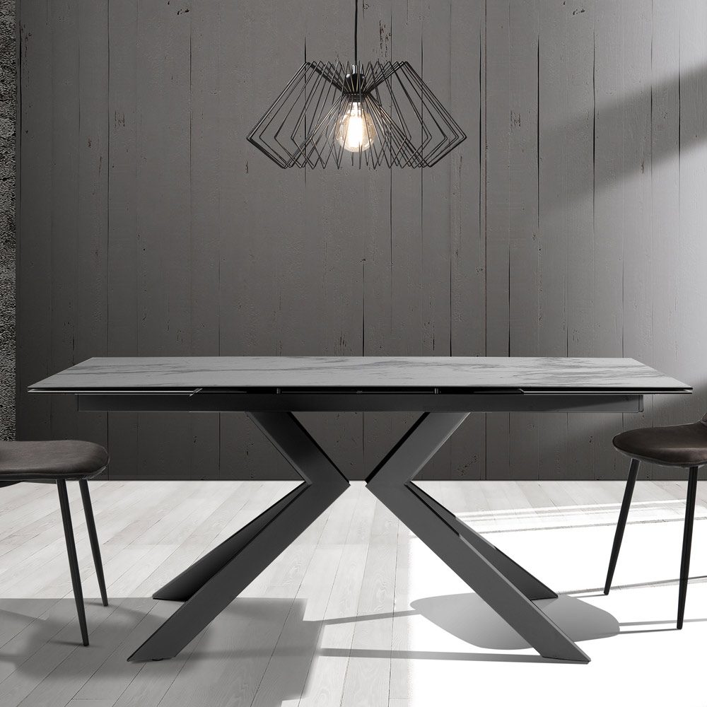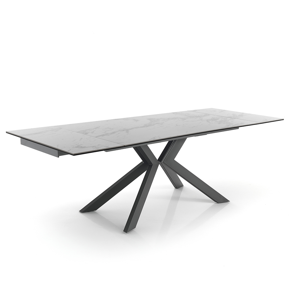Tavolo da pranzo allungabile fino a 240 cm in ceramica e metallo verniciato grigio.