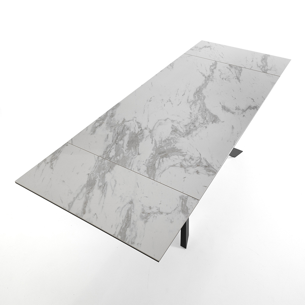 Tavolo da pranzo con basamento in metallo verniciato grigio opaco e piano allungabile fino a 240 cm in ceramica finitura marmo bianco opaco. Allunghe da 40 cm posizionate sotto al piano del tavolo. Grazie alla possibilità di essere allungato permette di ospitare un maggior numero di amici e parenti per passare piacevoli serate in compagnia.