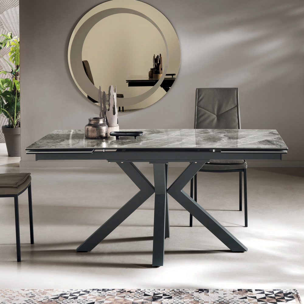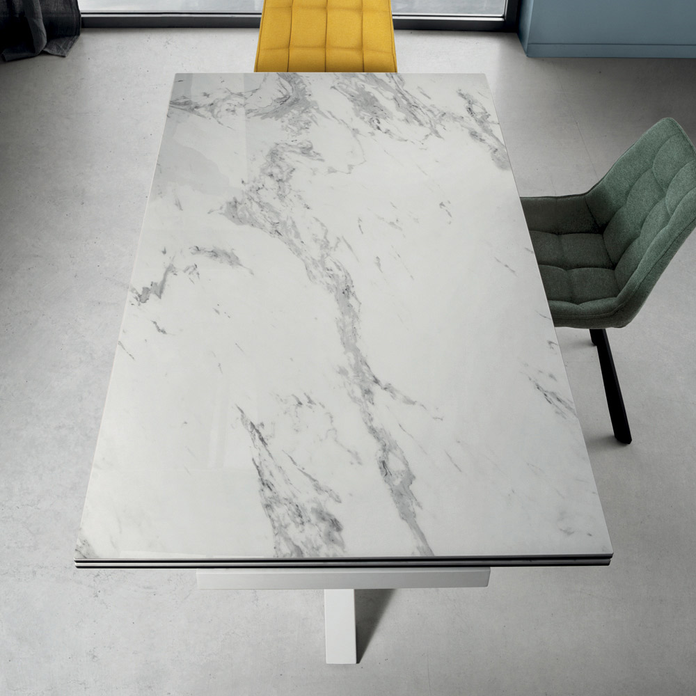 Tavolo da pranzo allungabile con piano in grès porcellanato effetto marmo e base in metallo verniciato dalle linee semplici e moderne, capace di regalare carattere al tuo ambiente. Dotato di 2 allunghe laterali da 40 cm e meccanismo a rotazione che permette di estendere il piano del tavolo in maniera facile e veloce per un risultato funzionale e particolarmente originale.