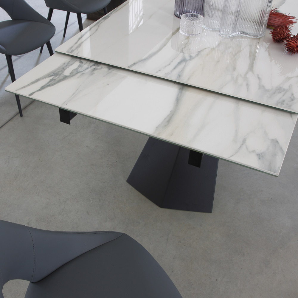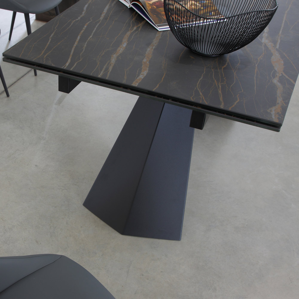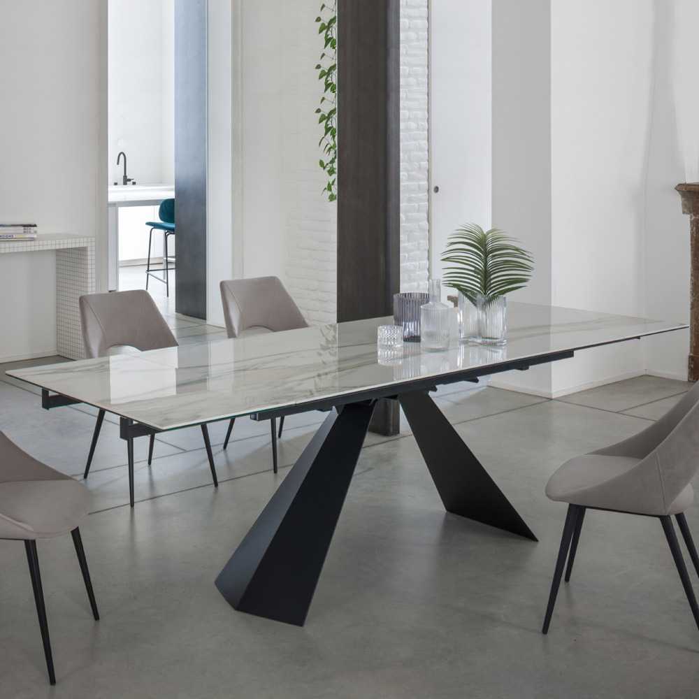 Tavolo da pranzo con piano allungabile fino a 270 cm in vetro ceramica.