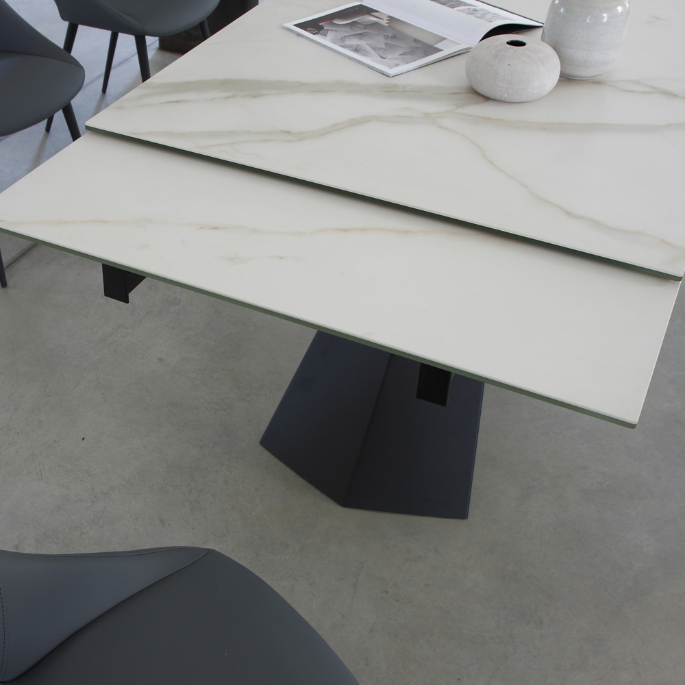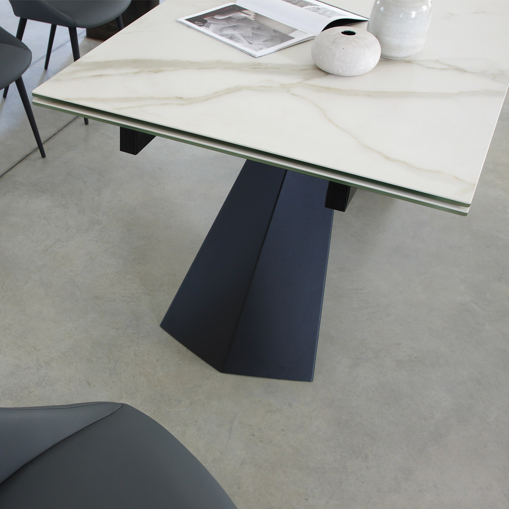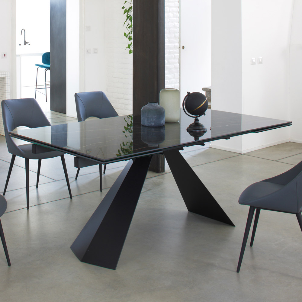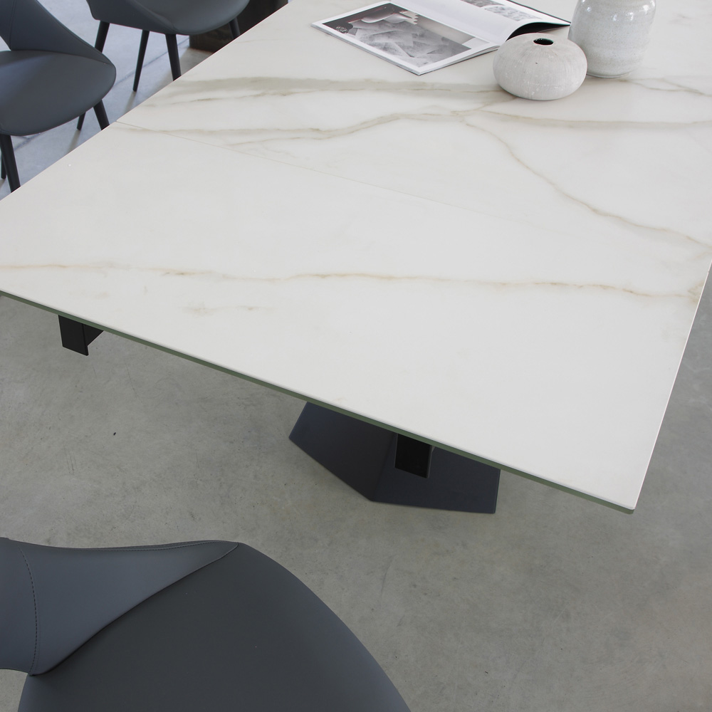 Tavolo da pranzo con piano allungabile fino a 270 cm in vetro ceramica.