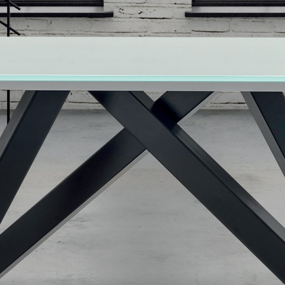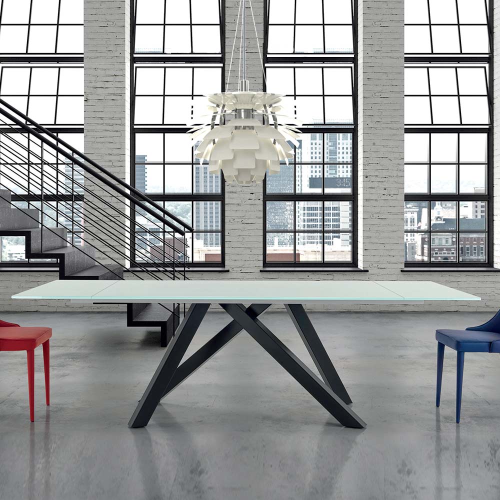 Tavolo da cucina allungabile fino a 278 cm con piano in vetro e base in acciaio nero made in Italy.