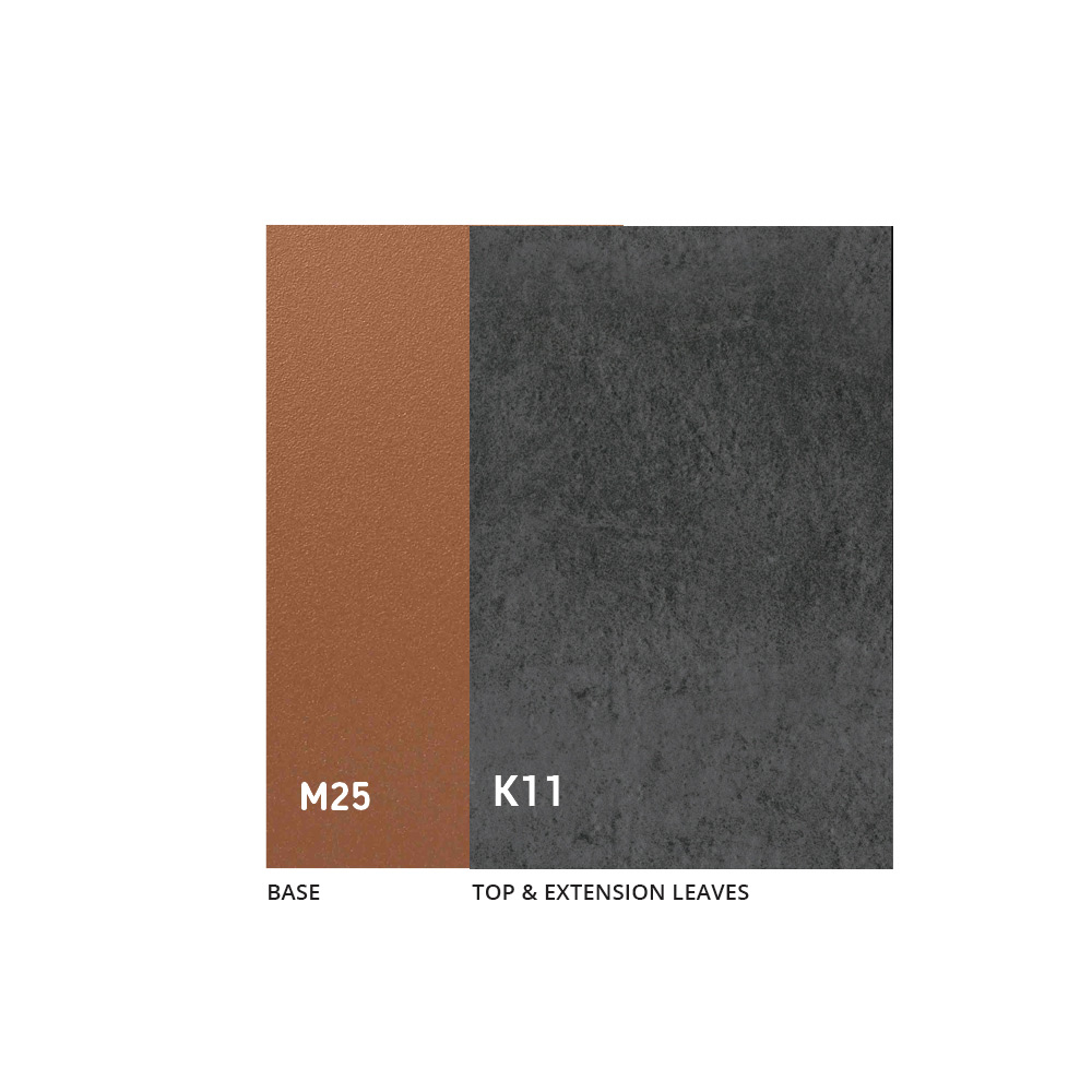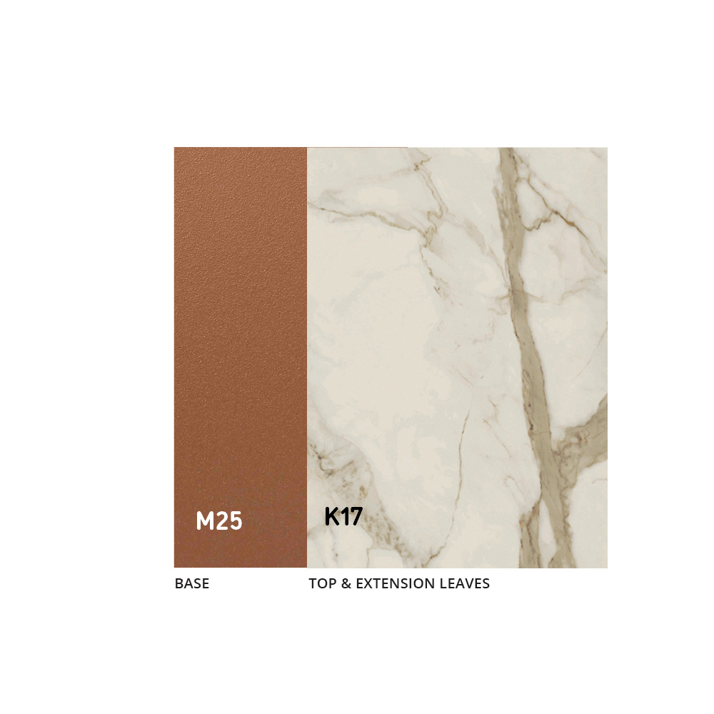 Tavolo realizzato con struttura in metallo verniciato rame goffrato e piano in ceramica 3 mm.