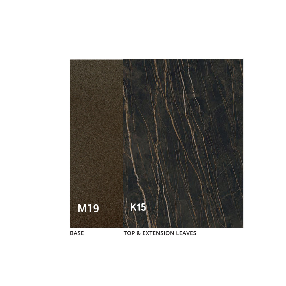 Tavolo realizzato con base in metallo verniciato bronzo goffrato e piano in ceramica 3 mm.