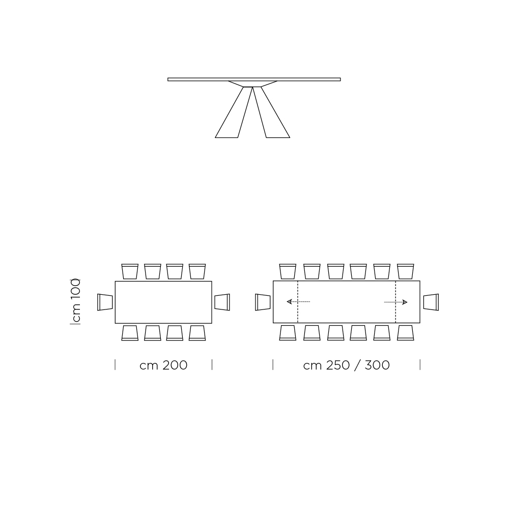 - L 200/300 x P 100 x H 75,5 cm 14 posti (2 allunghe da 50 cm).