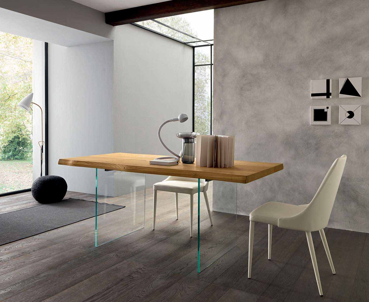 gambe in vetro trasparente, che sembrano far fluttuare il piano in legno dal forte rimando naturale e di