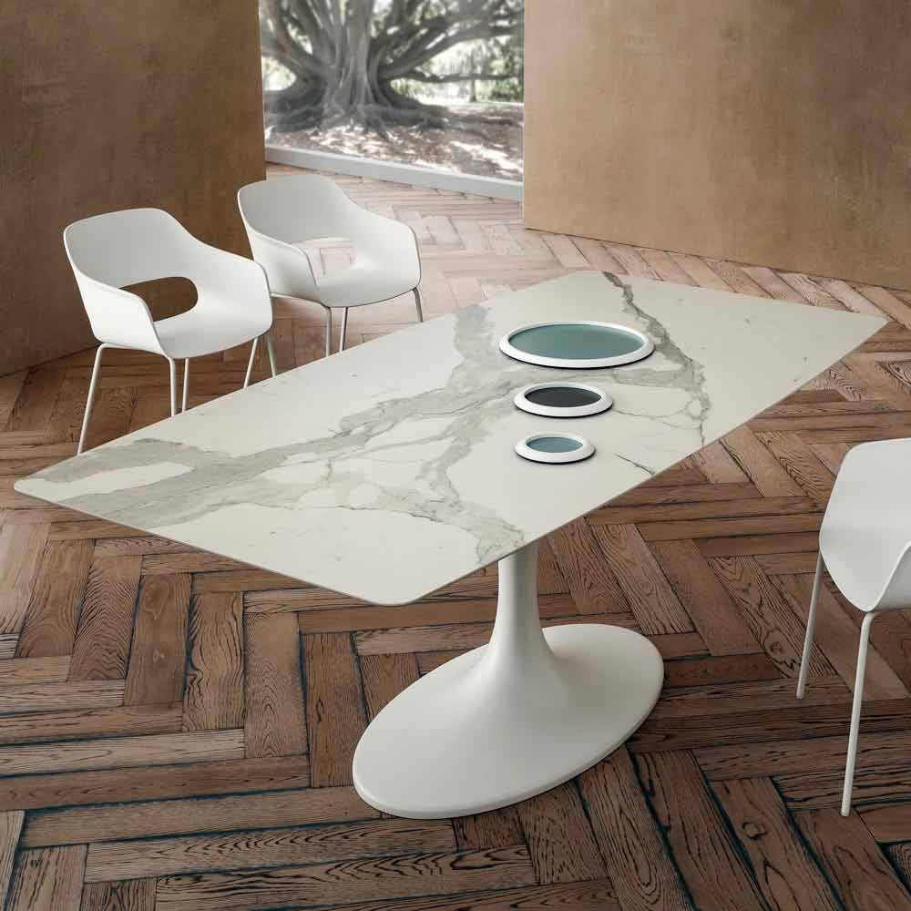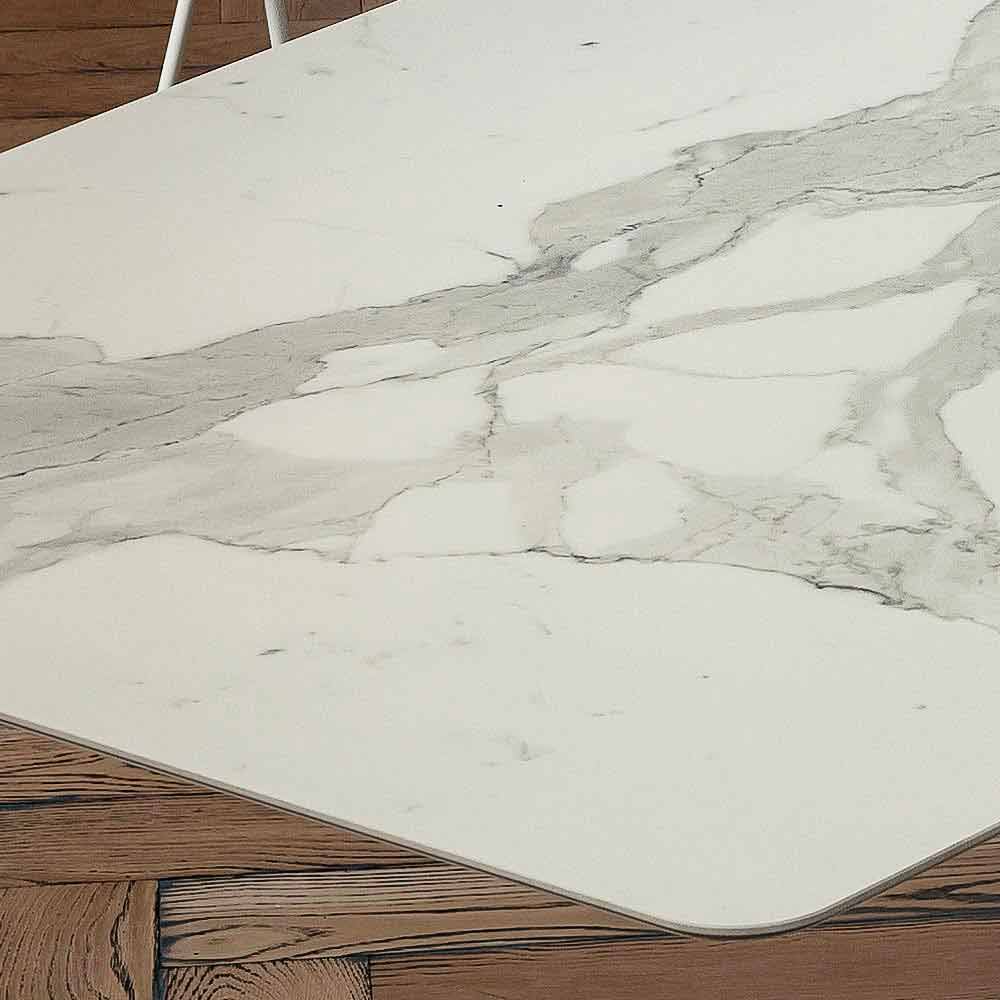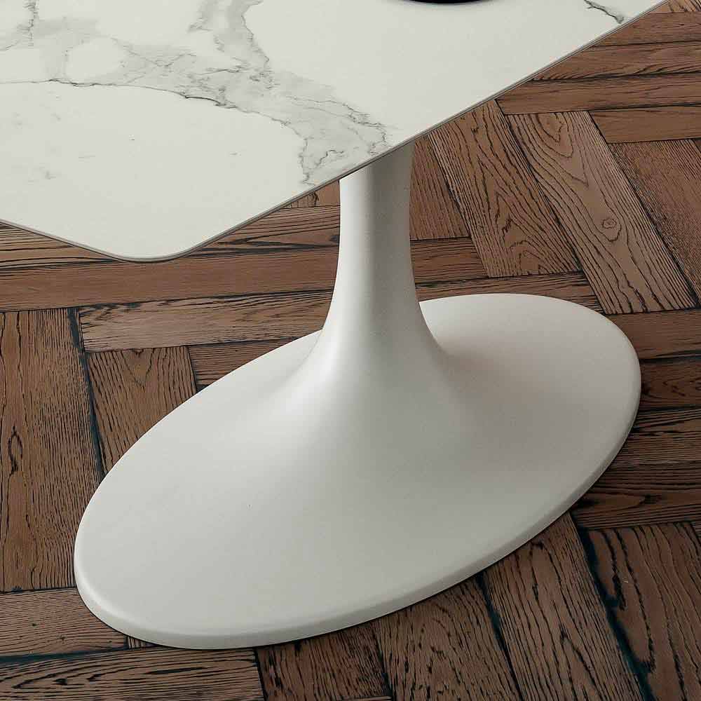 Tavolo cucina con piano a botte in laminam e base in marmo Made in Italy, alta qualità.