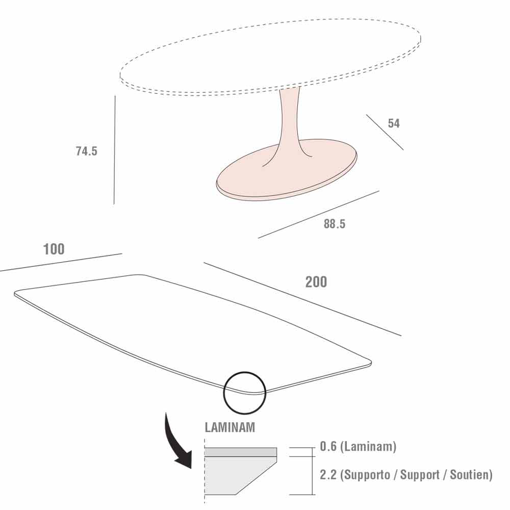 NB: il piano e la base del tavolo sono disponibili in una vasta gamma di materiali e finiture differenti.