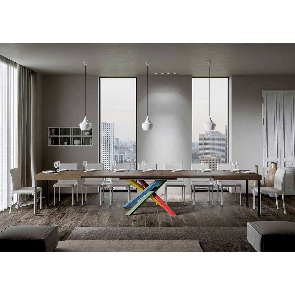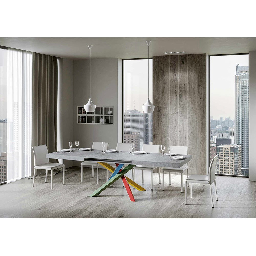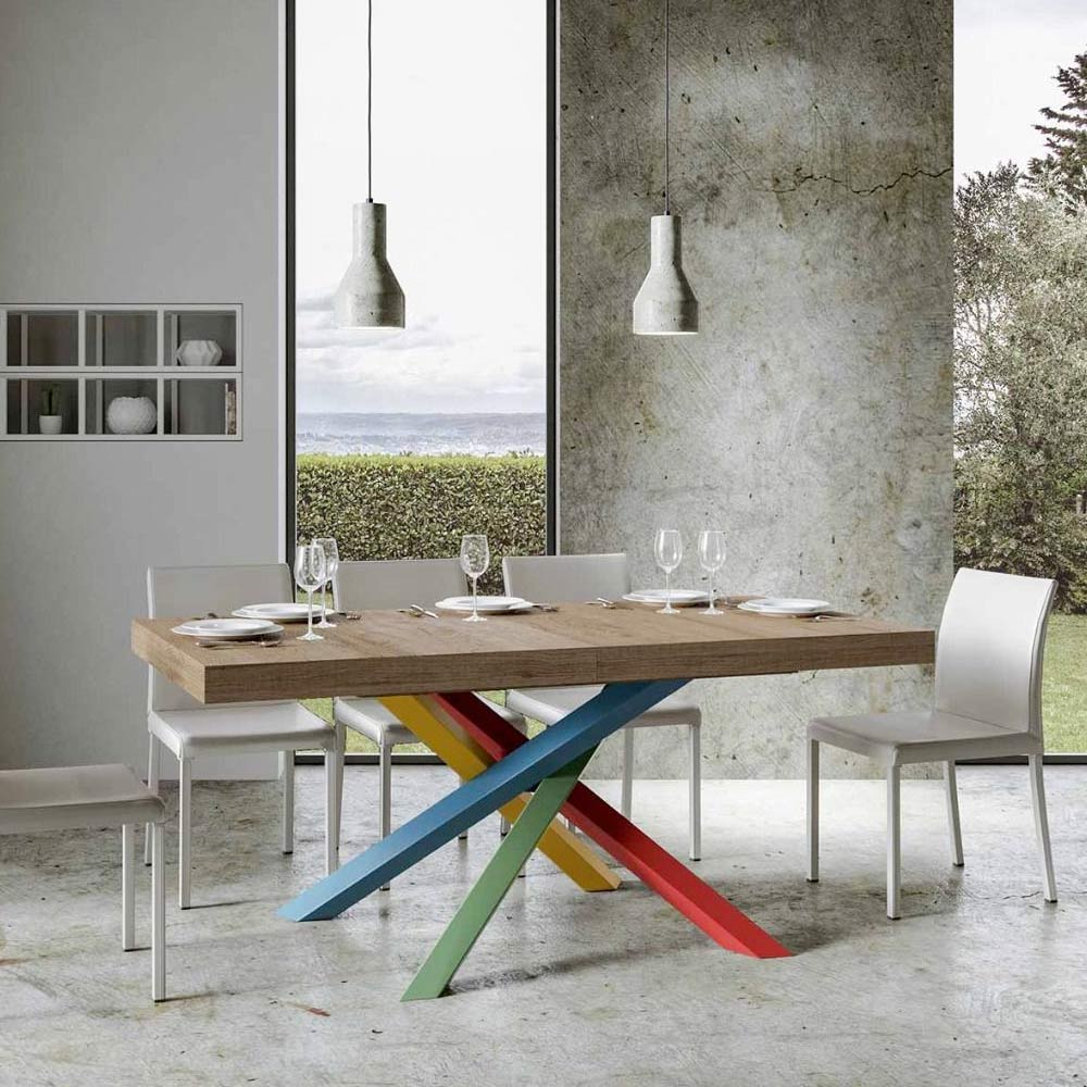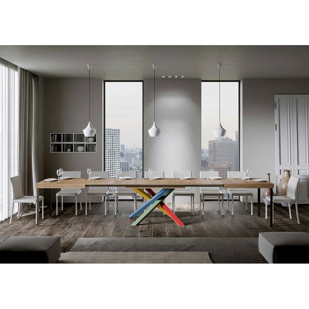 Scoprite il tavolo allungabile, un capolavoro di design moderno che si distingue per la sua silhouette unica e la sua funzionalità versatile. Il piano in legno esalta la luminosità degli spazi, offrendo una superficie liscia e robusta che invita all'uso quotidiano. La base del tavolo è un vero e proprio spettacolo geometrico, con gambe incrociate che si intrecciano in un gioco di colori. La combinazione proposta è : Gamba 1: Rosso Carminio (RAL 3002). Gamba 2: Verde Giallastro (RAL 6018). Gamba 3: Blu Distante (RAL 5023). Gamba 4: Giallo Segnale (RAL 1003). I colori RAL sono opachi. Questa combinazione non solo aggiunge un tocco di vitalità al design ma garantisce anche stabilità e resistenza. Il meccanismo di estensione del tavolo è tanto semplice quanto ingegnoso, permettendo di trasformare questo elegante mobile da un pratico tavolo per quattro a un'accogliente area per ospitare cene e riunioni più numerose.