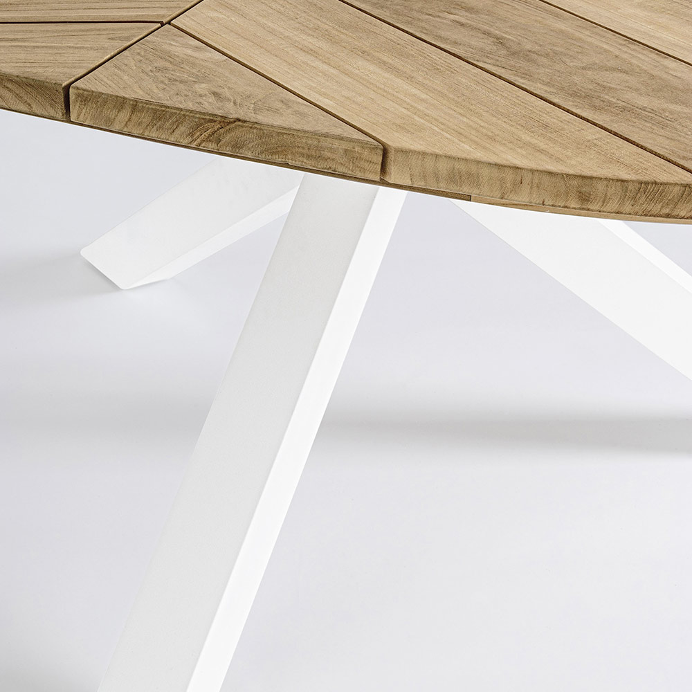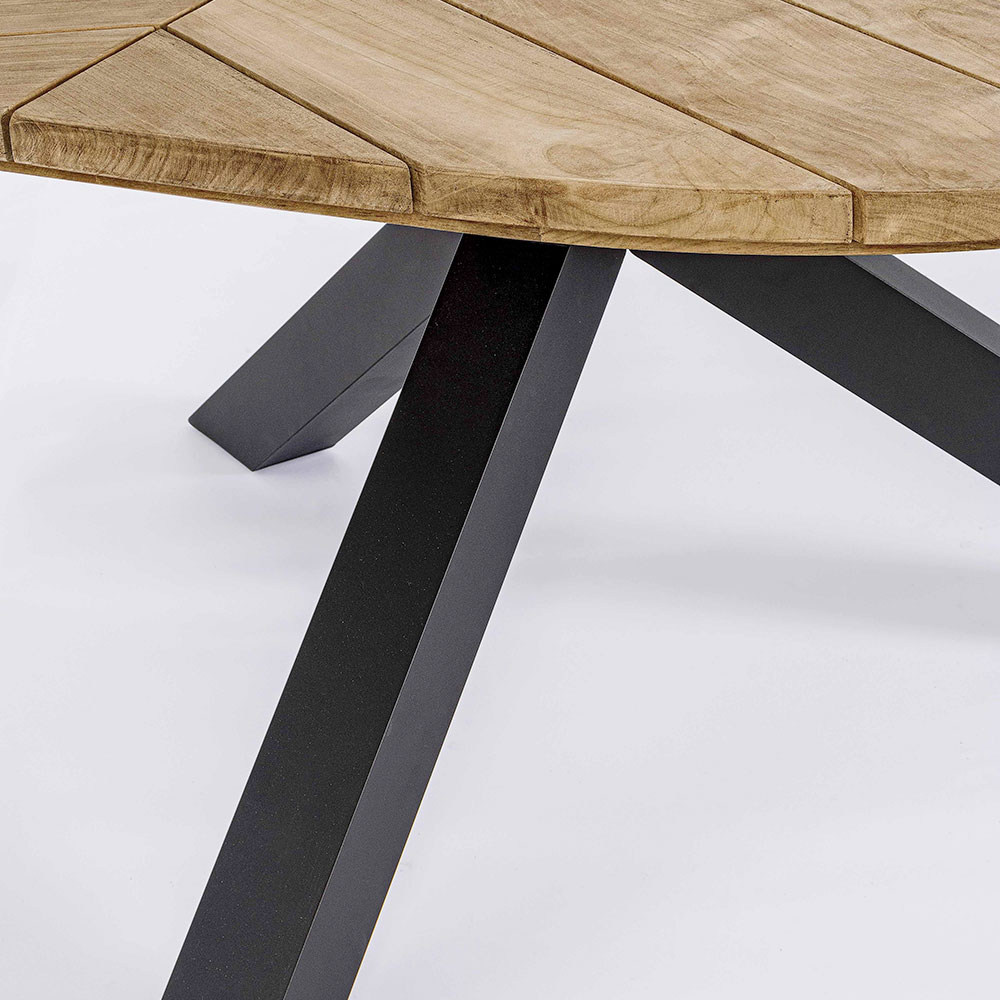 Tavolo da pranzo rotondo per esterno in alluminio con piano in legno di teak di qualità.