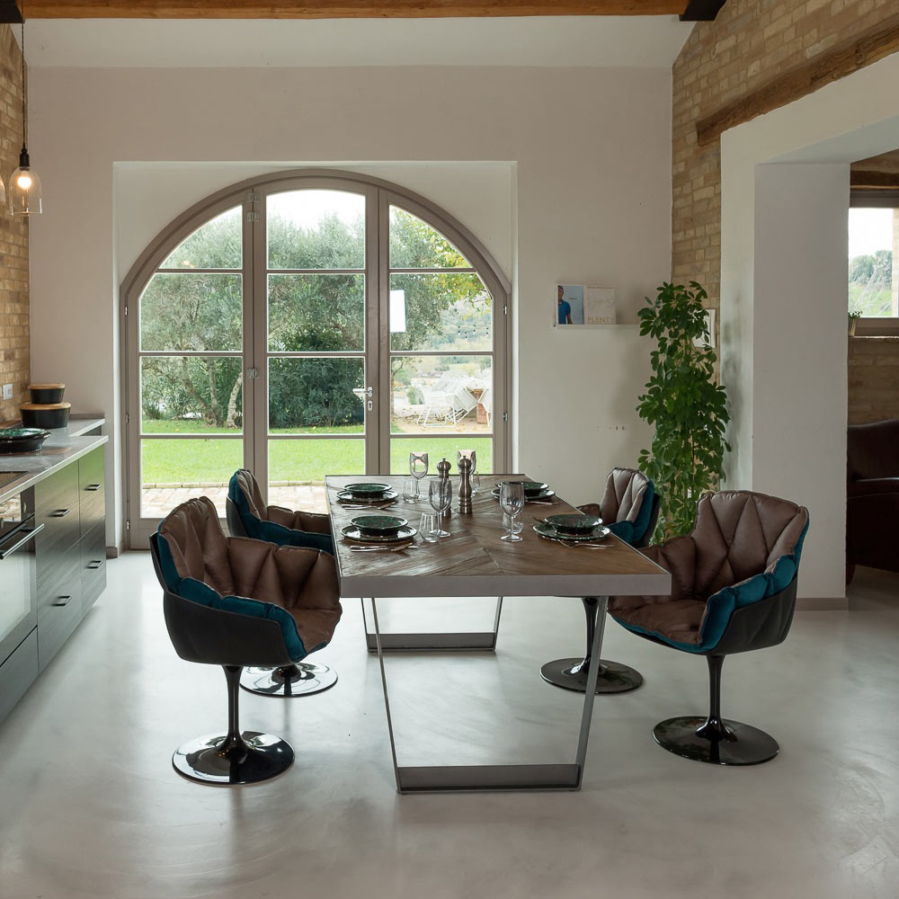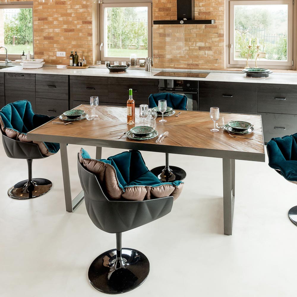 Tavolo da pranzo realizzato con top a spina di pesce in legno riciclato color coffee natural, cornice e struttura in metallo.