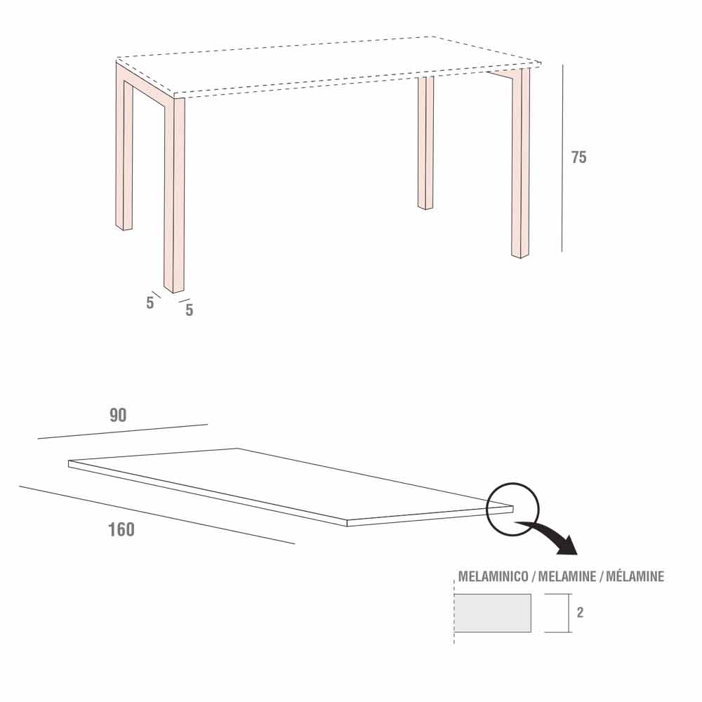 melaminico dotato di bordi in ABS incollati su poliuretano reattivo e gambe in