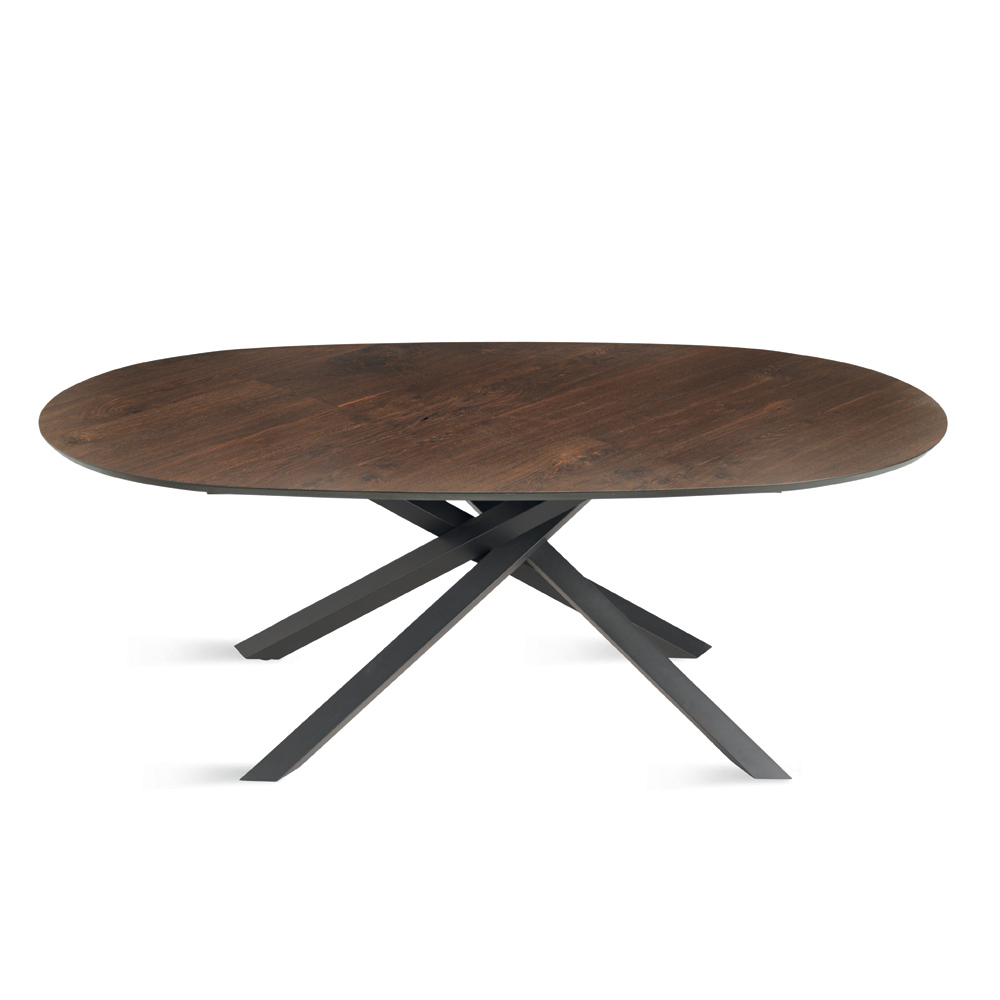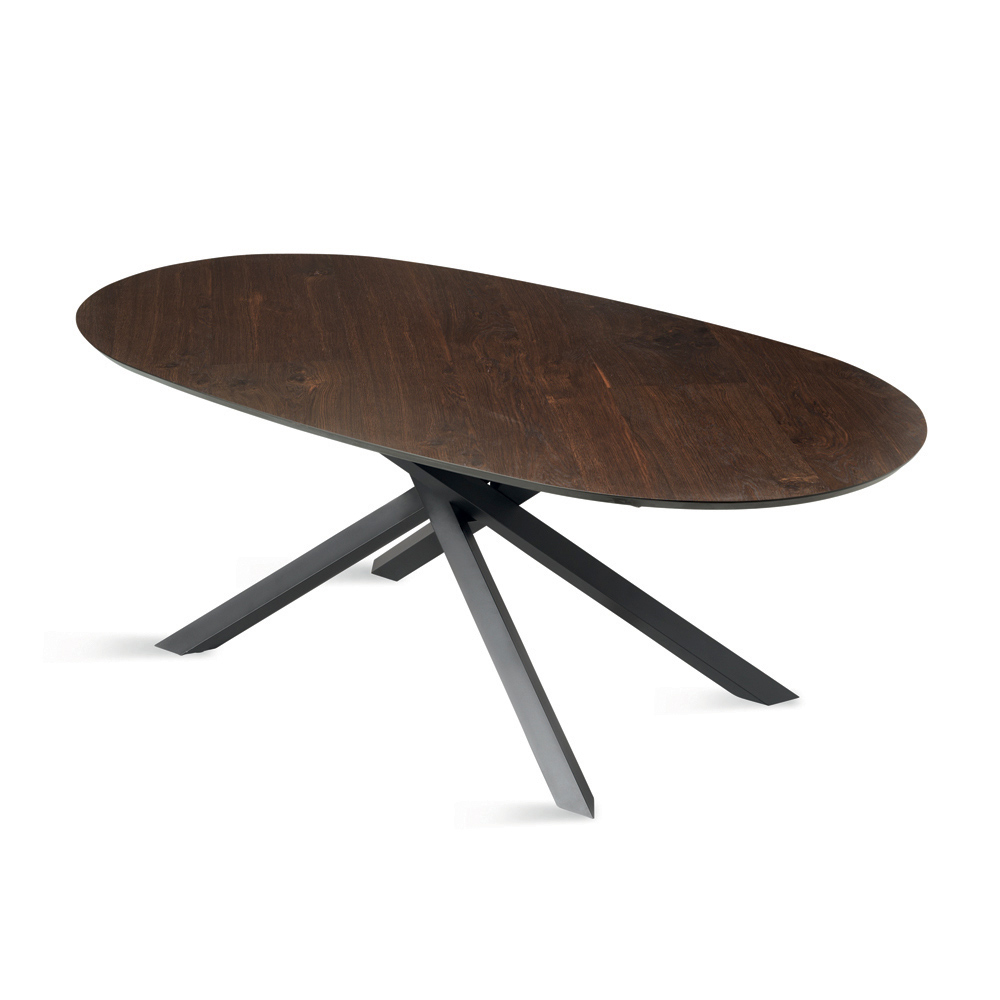 Elegante tavolo da pranzo di design Made in Italy, pensato per arredare con stile la sala da pranzo o la zona living. Il tavolo si distingue per il suo raffinato piano ovale in rovere impiallacciato, caratterizzato da un profilo morbido che favorisce la convivialità e dona naturale eleganza all’ambiente.