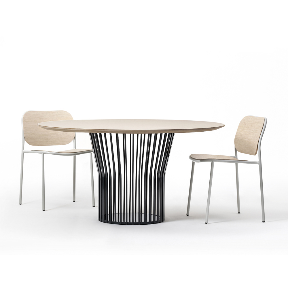 design originale e dinamico composto da tanti raggi di larghezze differenti che si piegano verso l'esterno nella parte superiore aprendosi poi per sostenere il piano. Il risultato è un