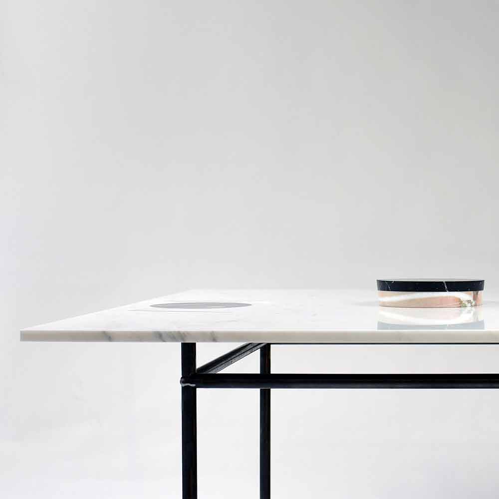 Il piano in marmo Michelangelo, dagli spessori minimi, è impreziosito da inserti in marmo nero marquinia e ottone riprodotti con la tecnica antica e tradizionale dell'intarsio, realizzato con pietre naturali e metalli preziosi.