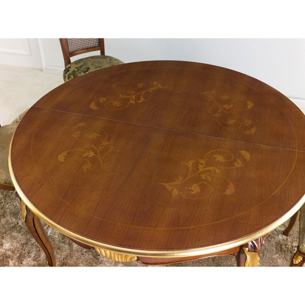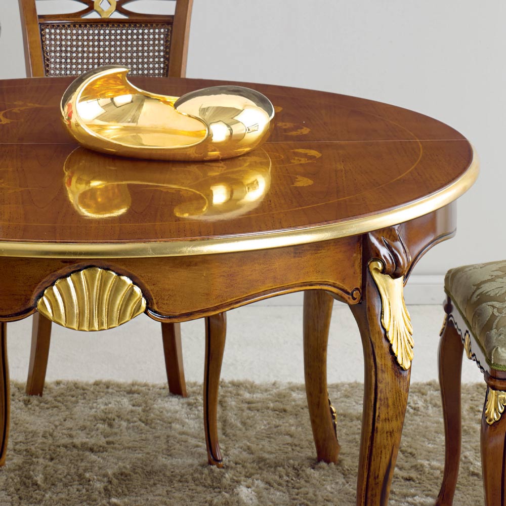 Tavolo da pranzo con piano rotondo allungabile fino a 240 cm grazie a due allughe interne da 50 cm, interamente realizzato in legno e disponibile nelle finiture noce bassano e oro anticato oppure legno bianco e argento.