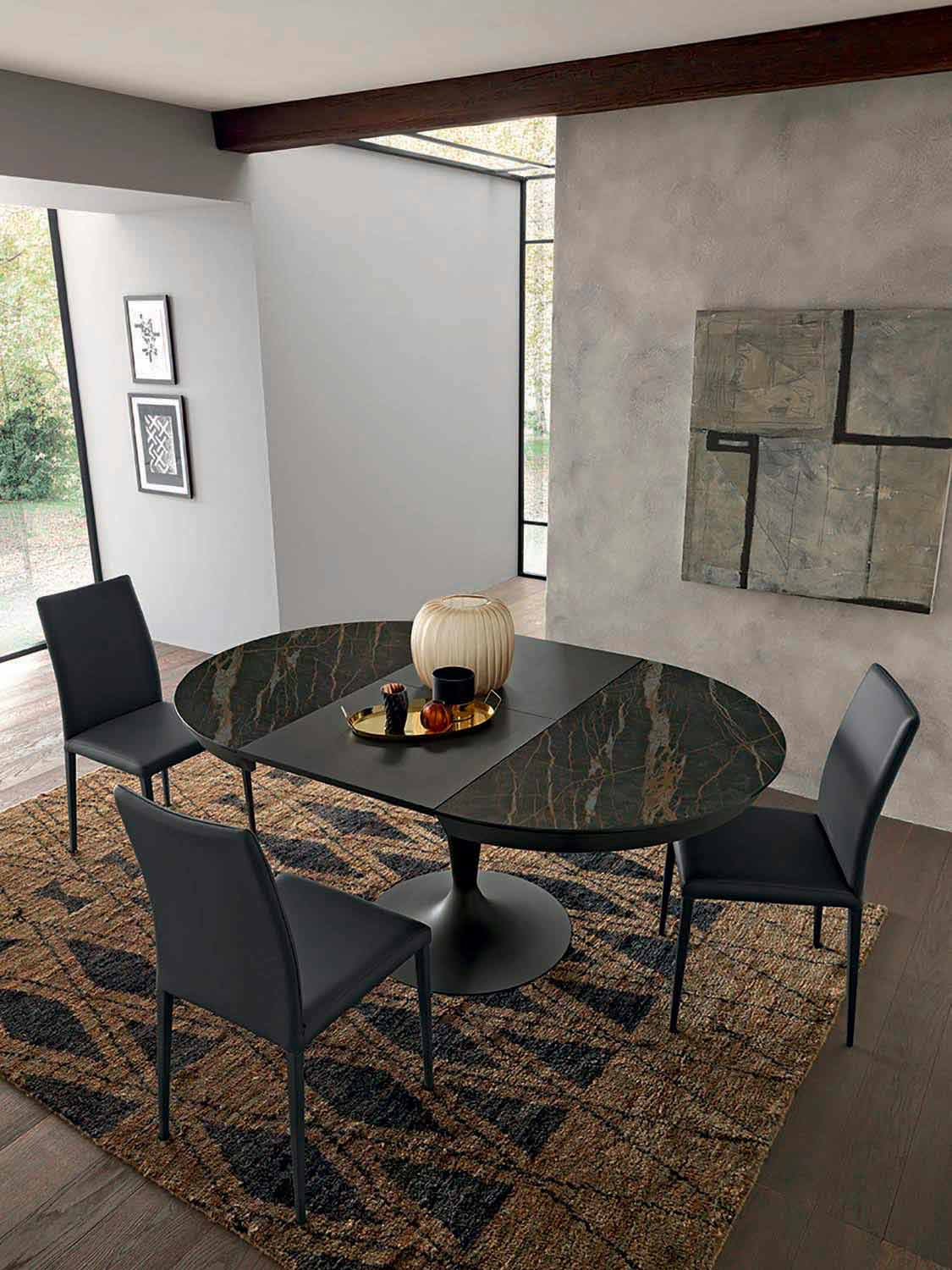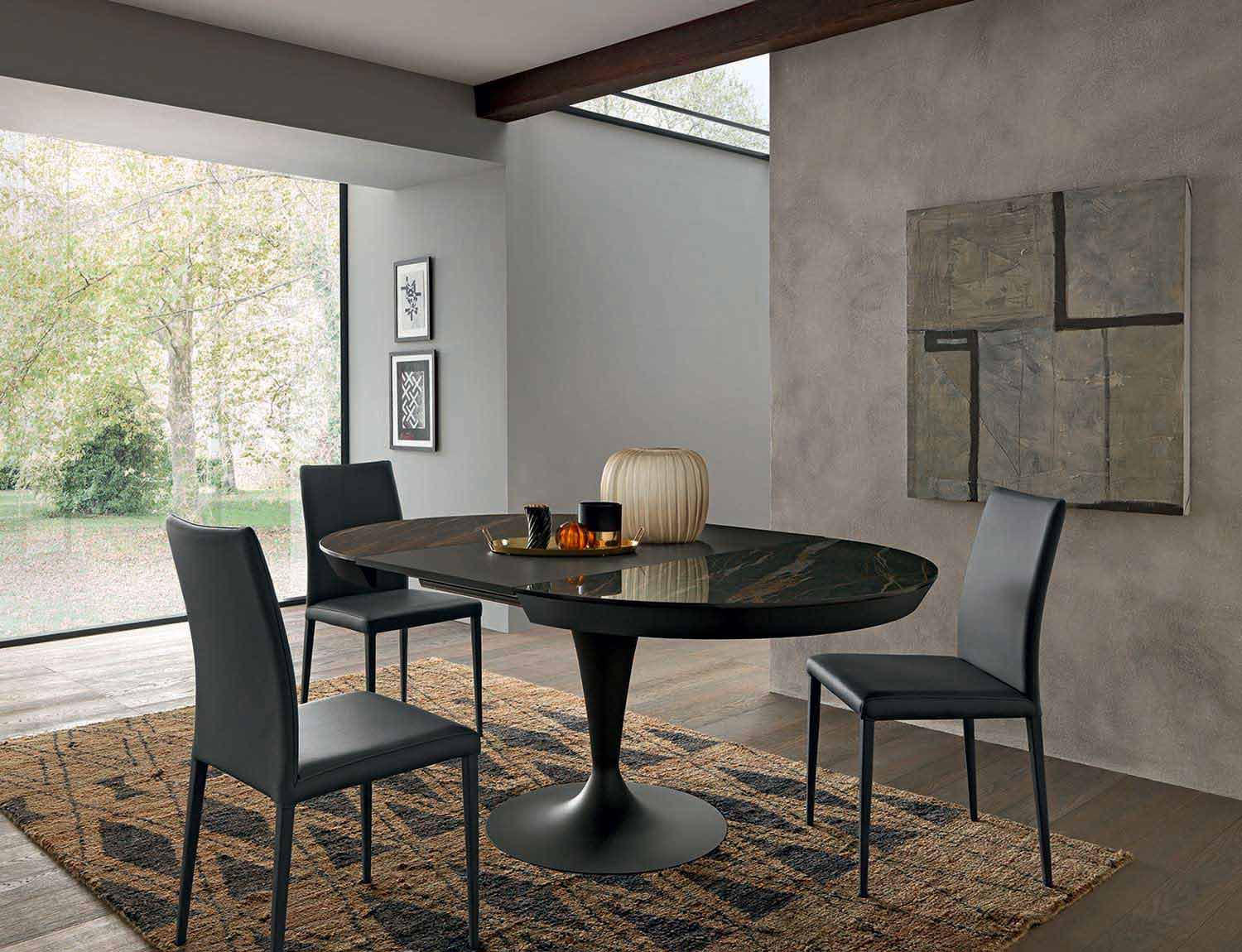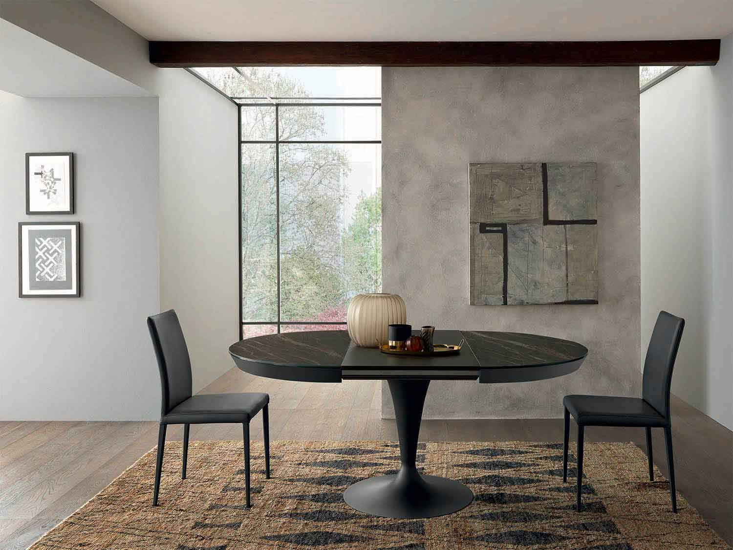 Tavolo da pranzo di design allungabile con piano rotondo in ceramica laminam e base in metallo Made in Italy.