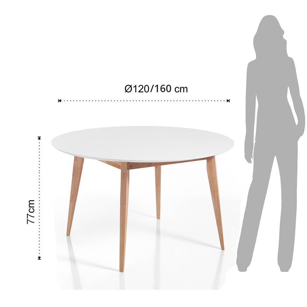 Tavolo da pranzo con piano rotondo allungabile realizzato in mdf laccato bianco opaco (sp. 3 cm) e gambe in legno massello finitura rovere sbiancato. Un prodotto dal design semplice e pulito ideale per chi ama uno stile di arredamento essenziale e versatile capace di completare lo stile della propria sala da pranzo o cucina con gusto e personalità. Il suo punto di forza è rappresentato dal piano allungabile il quale, grazie ad un'allunga da 40 cm ciascuna, raggiunge una lunghezza di 160 cm.