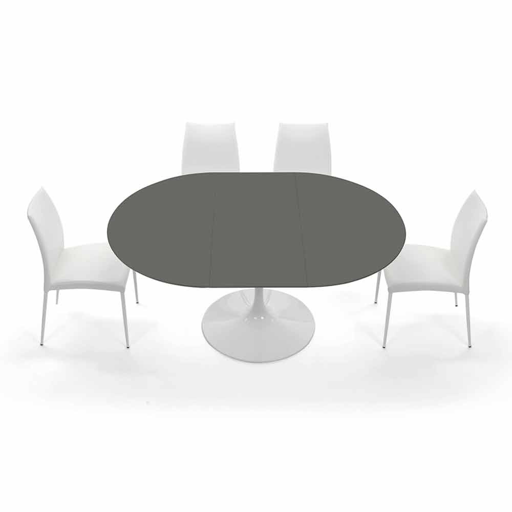 Tavolo da pranzo realizzato in Italia con piano rotondo allungabile in fenix (sp. 20mm) e basamento in fusione di alluminio laccato bianco lucido. Dall'incontro tra materie prime di qualità e un design esclusivo e rivoluzionario nasce un complemento d'arredo dall'anima moderna che riesce a completare lo stile di ogni ambiente portando con sè innovazione e personalità. Ad accrescerne il lato funzionale è il piano allungabile il quale, grazie ad un'allunga esterna da 50 cm, può raggiungere una lunghezza di 170 cm permettendo di ospitare fino a 8 persone tornando poi ad occupare uno spazio più contenuto una volta richiuso. La sua estetica è invece caratterizzata dal piano in fenix il quale, tramite l'utilizzo di resine innovative, offre una superficie resistente, piacevole al tatto ed estremamente opaca, elementi che oltre ad accrescere la funzionalità del tavolo ne sottolineano e completano il design donando un tocco originale e di classe.
