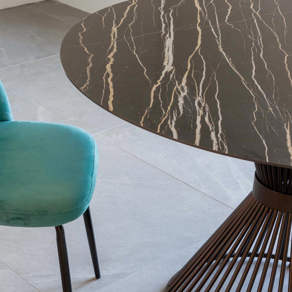 Tavolo rotondo da soggiorno realizzato in ceramica e acciaio
