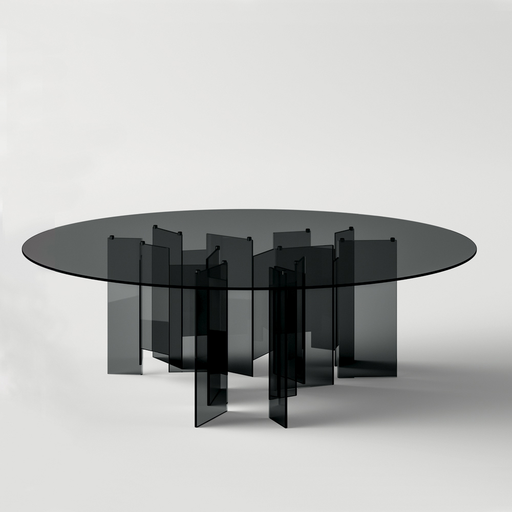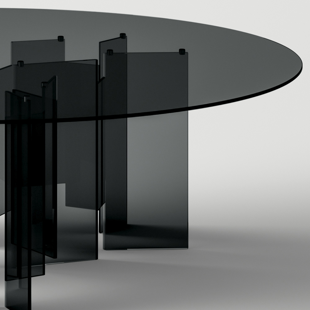 La scelta di utilizzare un materiale semplice come il vetro ma al tempo stesso di forte impatto visivo caratterizza l'intera estetica del prodotto rendendolo originale, contemporaneo ed elegante, ideale per chi ricerca una soluzione d'arredo capace di completare la zona living della casa con personalità moderna e imponente. A livello visivo ciò che colpisce è indubbiamente la particolare conformazione della base la quale è composta da numerose lastre di vetro unite in maniera asimmetrica per dare al tavolo un senso di dinamismo insieme ad un tocco esclusivo e ricercato.