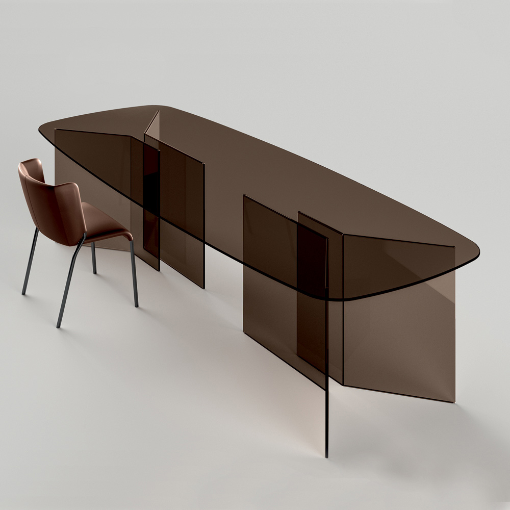 Tavolo da pranzo interamente realizzato in vetro ultraresistente con piano rettangolare sagomato. Un complemento dal carattere ricercato che nasce da un processo produttivo 100% Made in Italy grazie ad abili artigiani esperti nella lavorazione del vetro, un unico materiale che da vita a un pregiato tavolo di design.