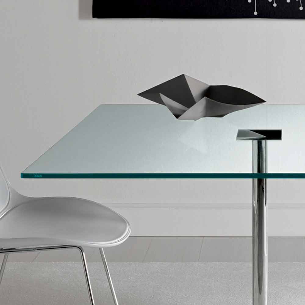 Tavolo da pranzo di lusso quadrato con piano in vetro extrachiaro e base in metallo cromato, prodotto in Italia.
