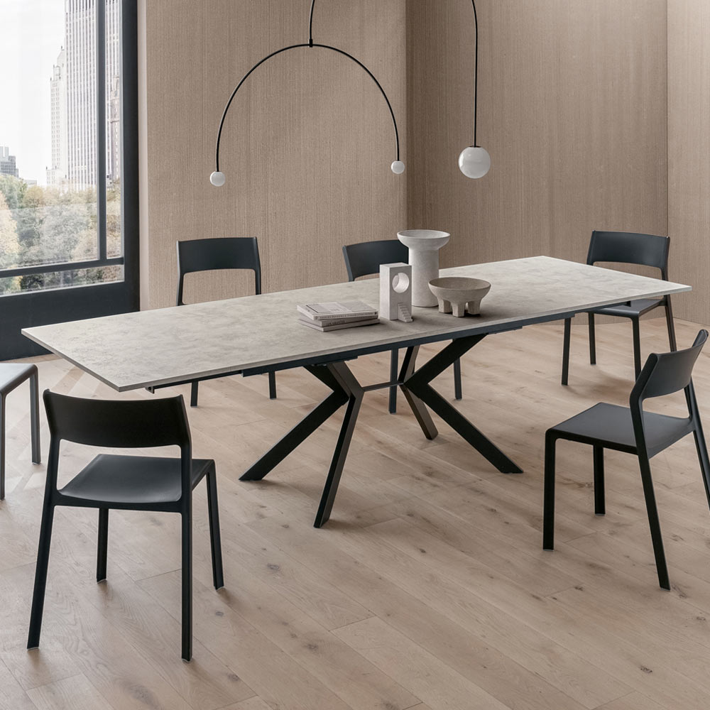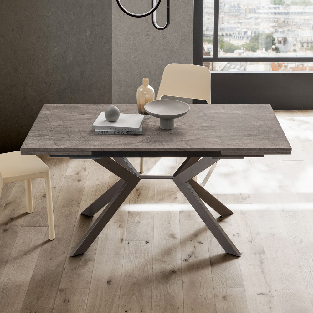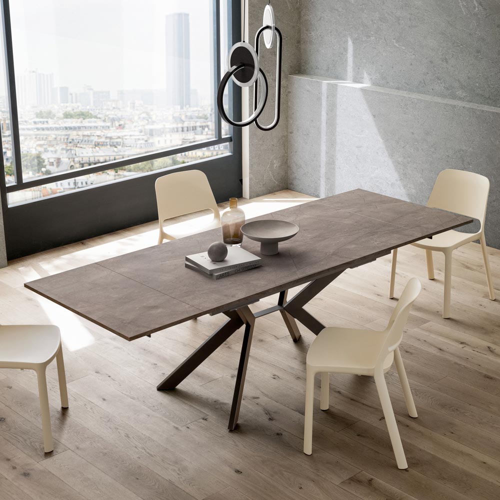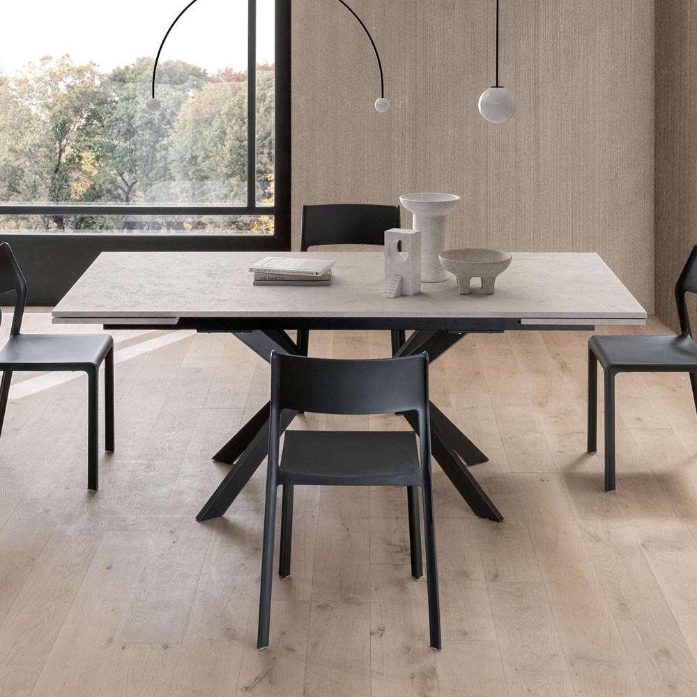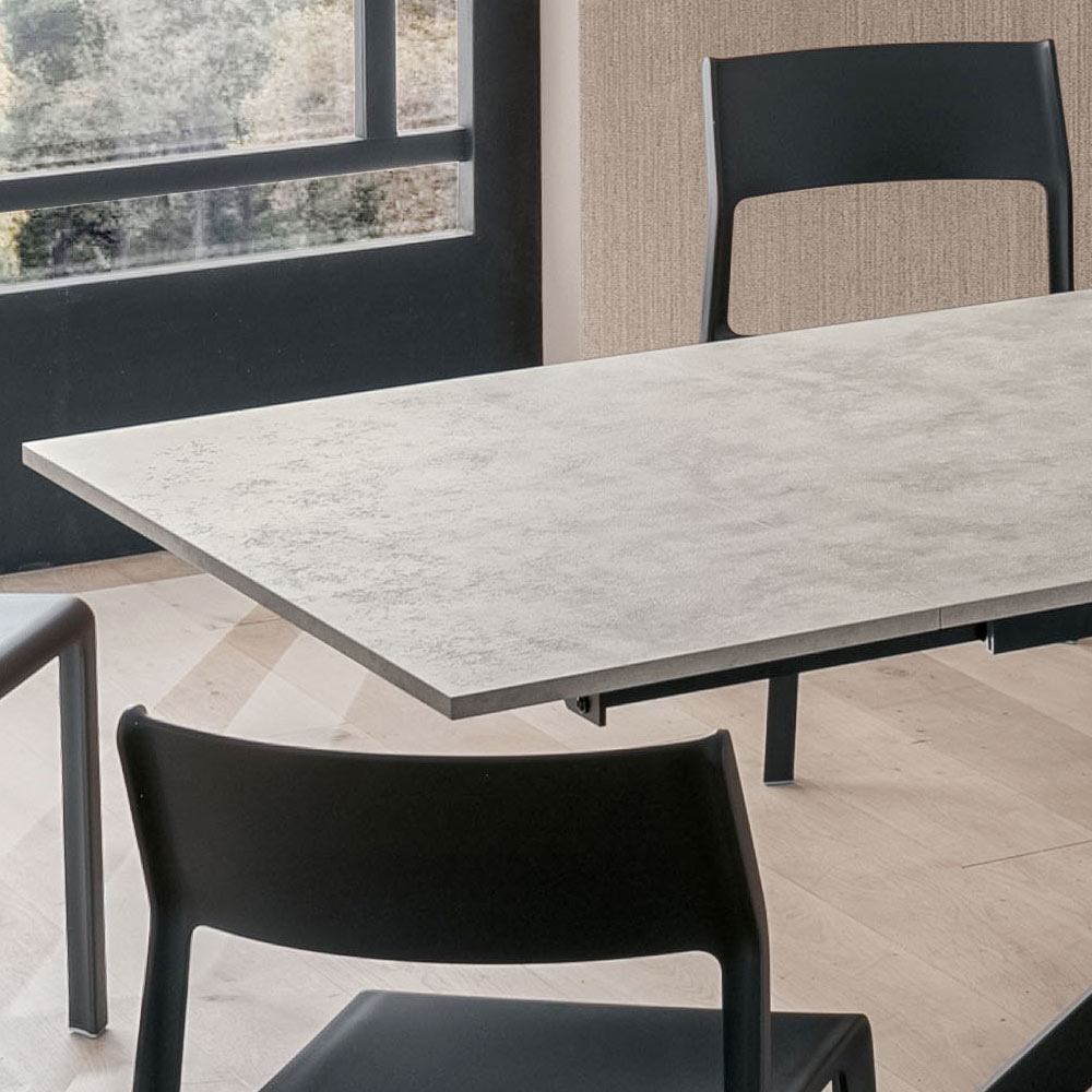 Eleganza e praticità si fondono in questo tavolo allungabile in HPL e metallo, pensato per chi desidera un arredo di forte impatto visivo, ma estremamente funzionale.