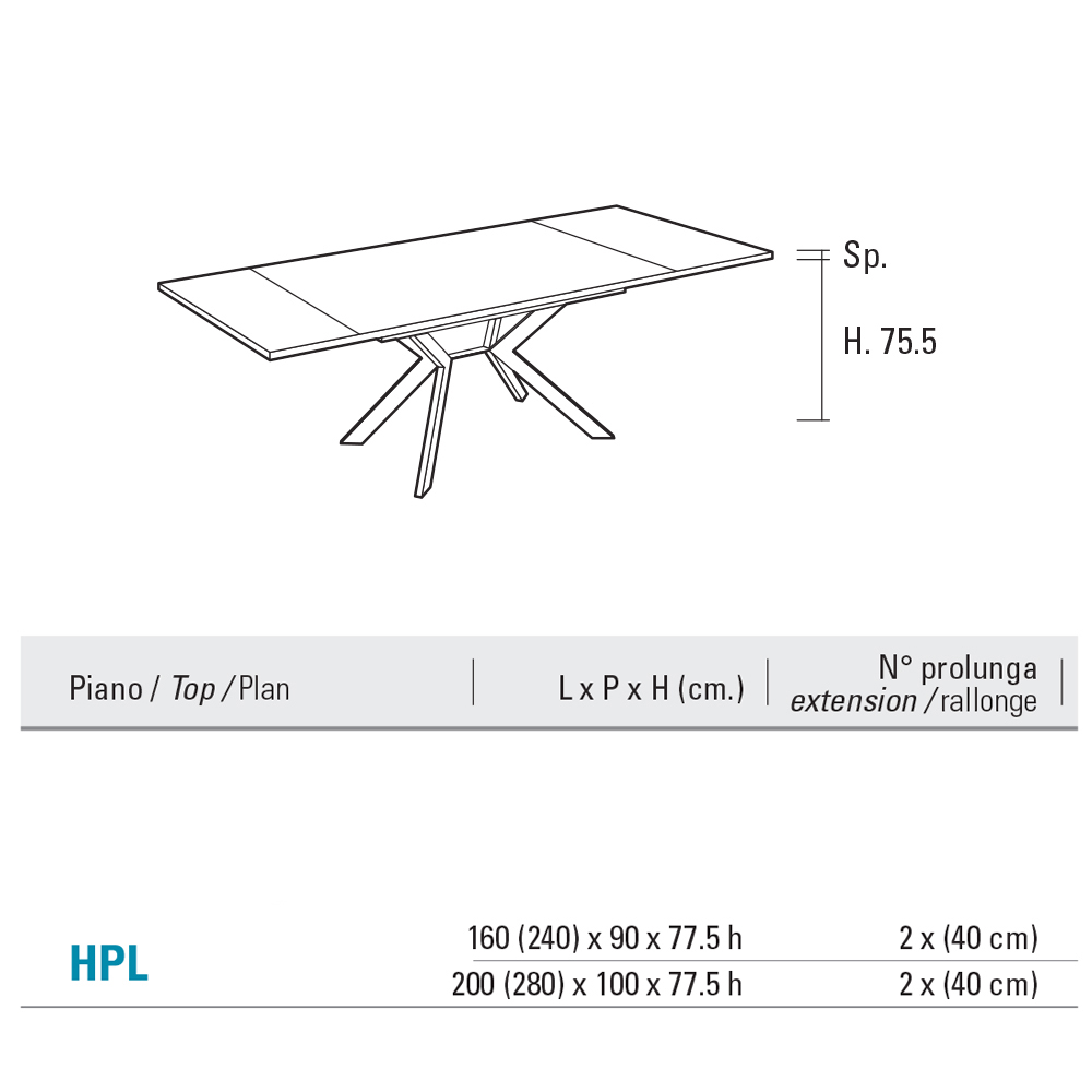 Il piano in HPL con venature offre un’estetica raffinata e naturale, con una superficie resistente, ideale per l’uso quotidiano. Grazie al sistema di allungamento con prolunghe laterali, il tavolo si estende con estrema facilità, adattandosi a pranzi in famiglia o serate con amici.