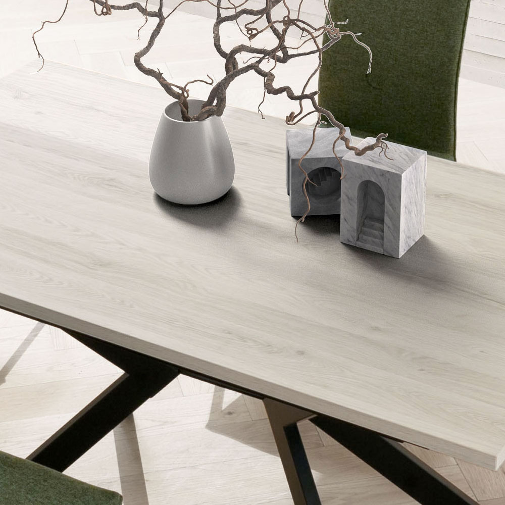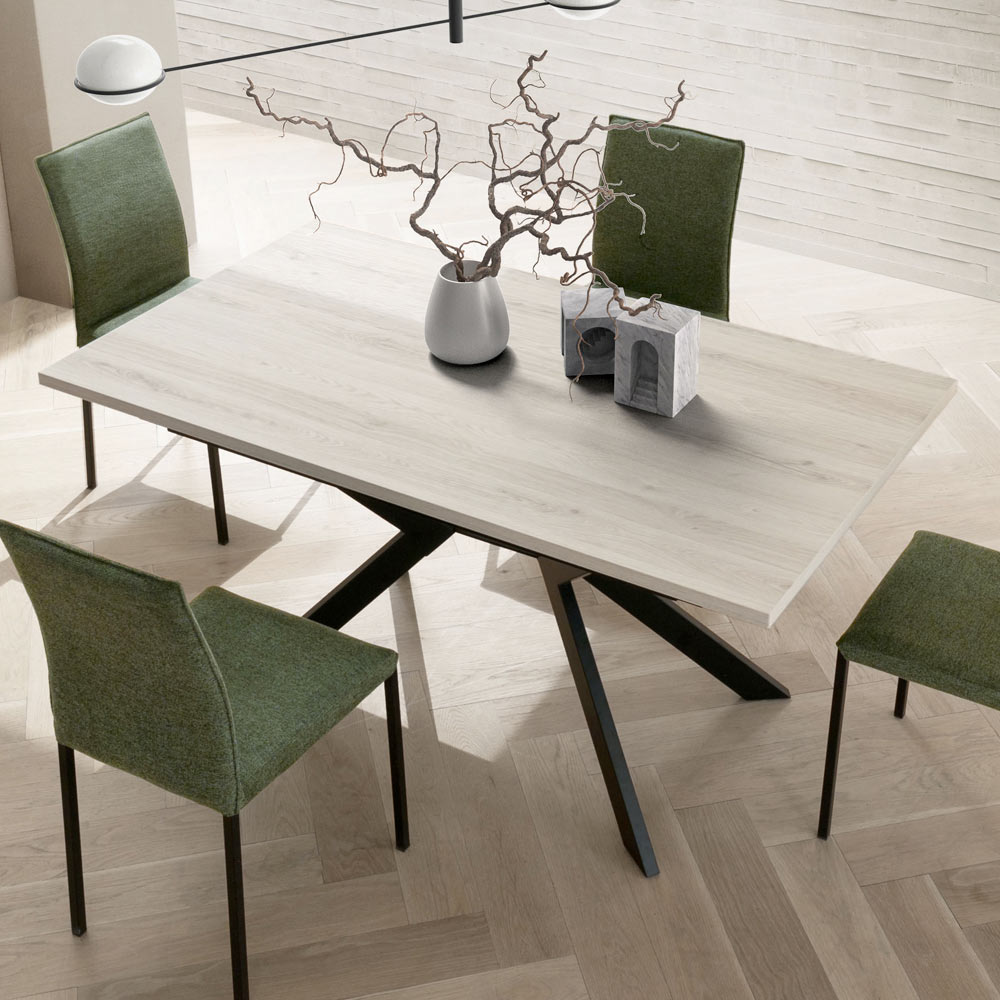 La base, in metallo verniciato e dal design geometrico incrociato, offre stabilità e un tocco scultoreo che non passa inosservato. Una soluzione d’arredo perfetta per sale da pranzo, open space o ambienti contract dallo stile ricercato.