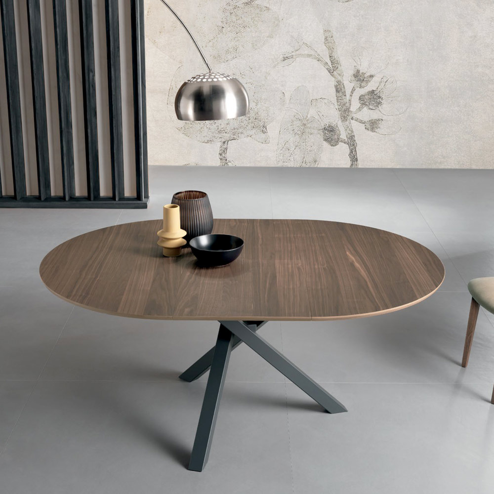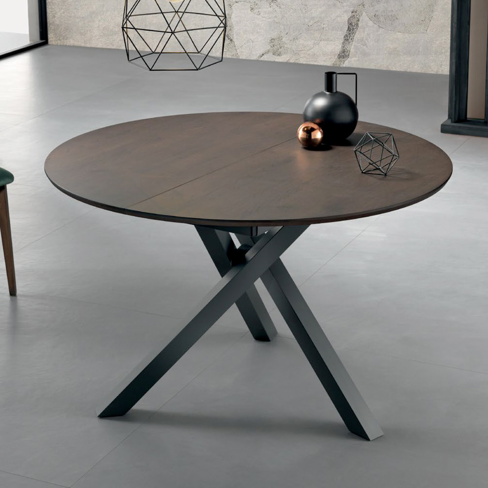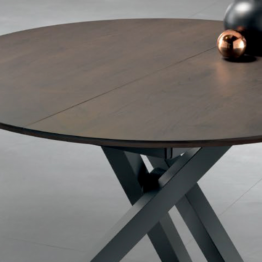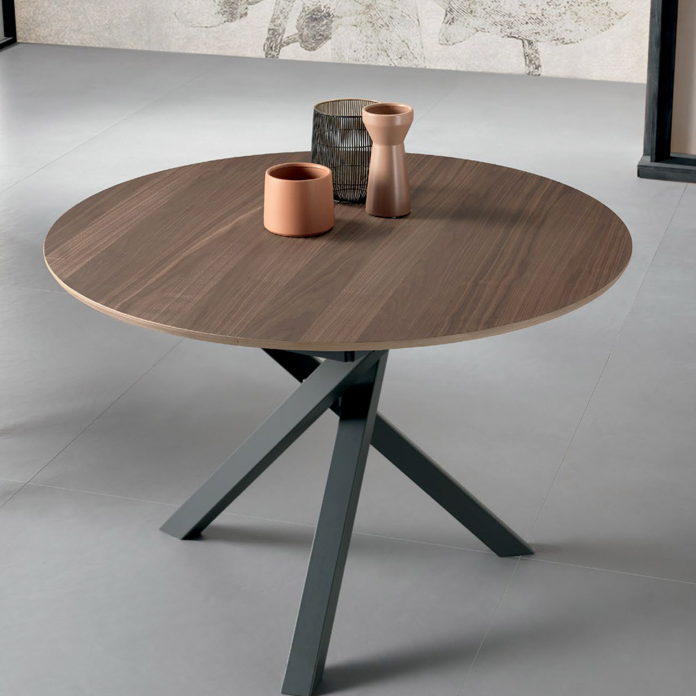 Tavolo rotondo diametro 120 cm allungabile a 170 cm con piano impiallacciato in noce canaletto sp. 20 mm, profilo inclinato.