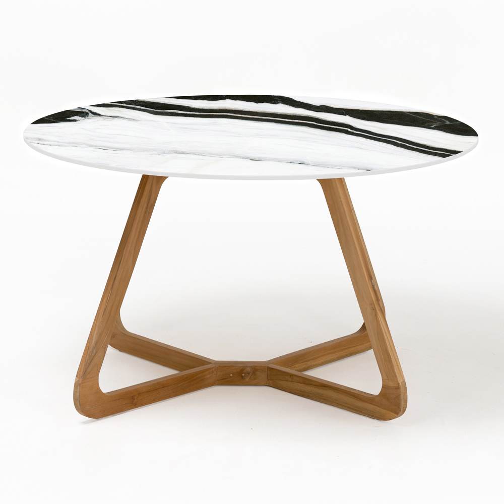 Questo tavolo da esterno è un pezzo di design esclusivo che combina la bellezza naturale del legno con la praticità della ceramica moderna. Il piano di questo tavolo imita perfettamente il marmo Panda White, noto per le sue venature nere su uno sfondo bianco candido, offrendo un contrasto visivo straordinario che aggiunge un tocco di eleganza a qualsiasi ambiente esterno.