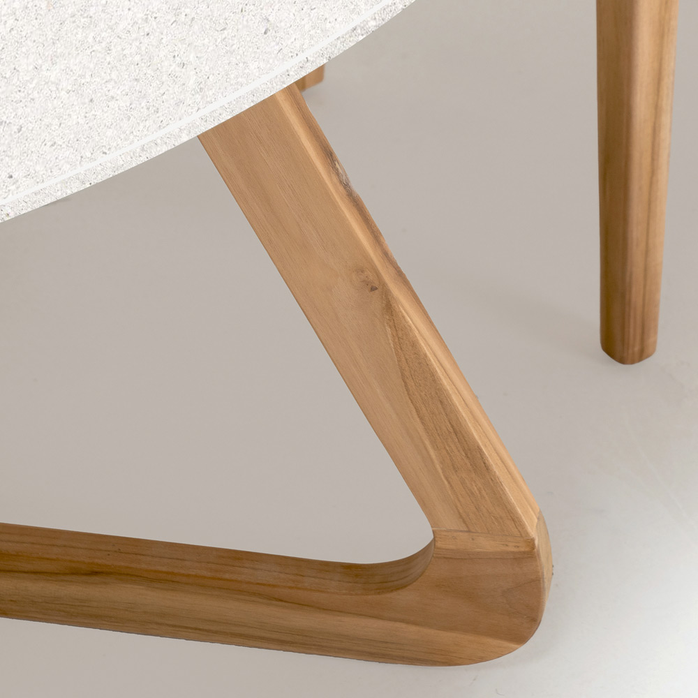 La base in legno si fonde armoniosamente con il moderno piano in ceramica, offrendo una combinazione di calore naturale e design moderno. Questa composizione non solo è esteticamente piacevole ma garantisce anche stabilità e durabilità grazie ai materiali di alta qualità scelti per resistere agli elementi esterni.