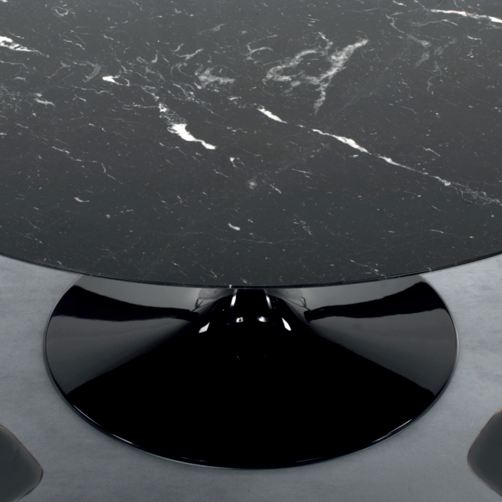 Tavolo rotondo moderno con piano in marmo Nero Marquinia prodotto artigianalmente in Italia.