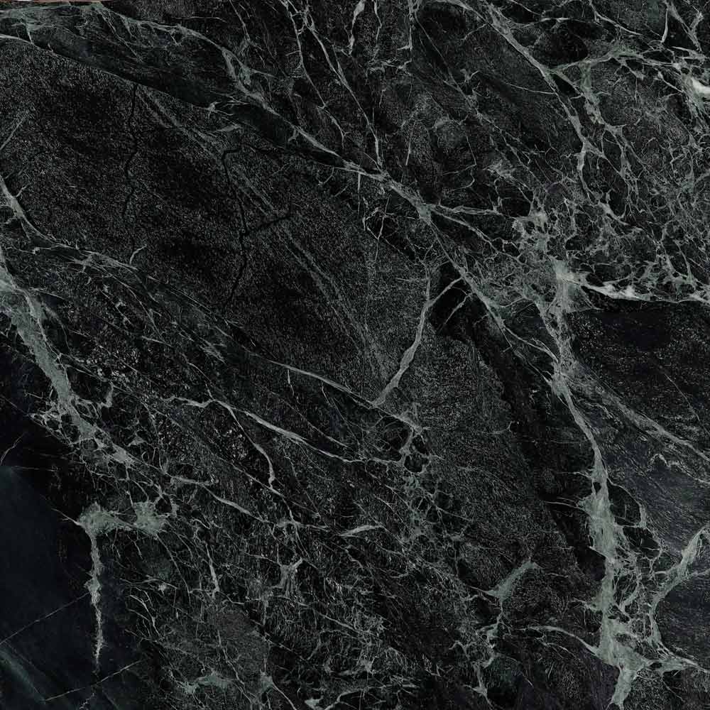 Tavolo da pranzo con piano rotondo in marmo verde alpi e basamento in alluminio lucido made in Italy