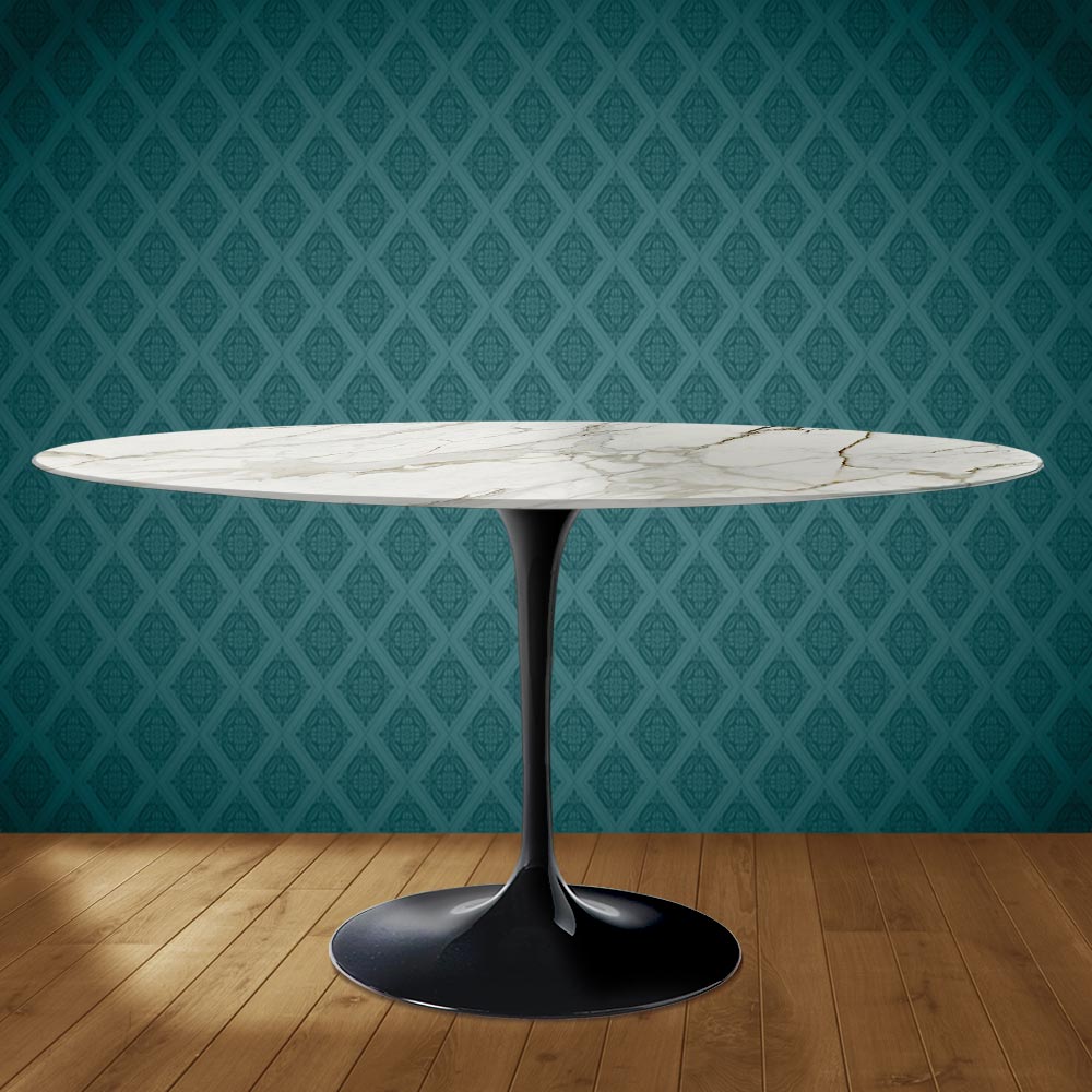 Tavolo da pranzo con piano ovale in ceramica lucid, effetto marmo calacatta lucido, e basamento in alluminio lucido interamente Made in Italy. Questo tavolo ha due caratteristiche che lo rendono unico nesuo genere: la forma ovale e la ceramica lucid. L'innovativa forma ovale è sempre più di moda per arredare con originalità gli ambienti living e le cucine in quanto si adatta perfettamente a uno stile moderno e ricercato. La complessa e sofisticata grafica e colorazione della ceramica lucid rende la stanza un luogo caldo e accogliente garantendo funzionalità e qualità anche con lo scorrere detempo. Questo tavolo è l'ieale per chi vuole dare all'ambiente un'anima unica e indimenticabile.