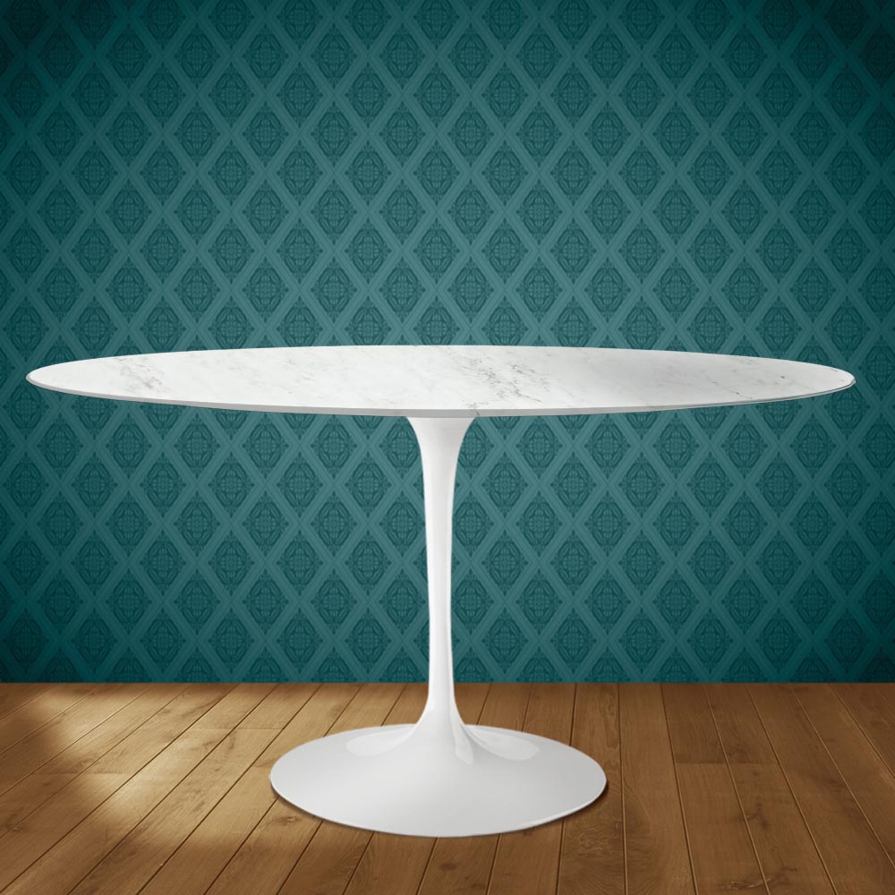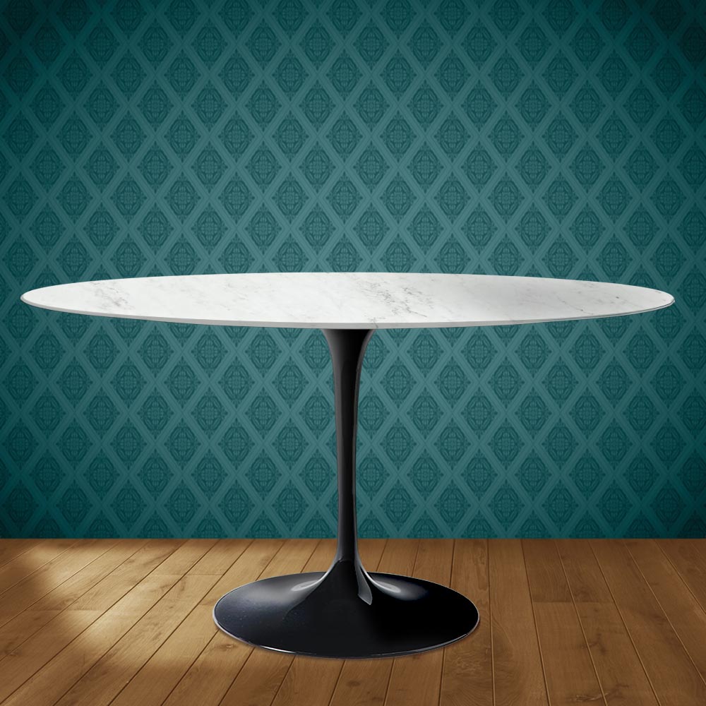 Tavolo da pranzo con piano ovale in ceramica salina, effetto marmo carrara lucido, e basamento in alluminio lucido interamente Made in Italy. Questo tavolo ha due caratteristiche che lo rendono unico nesuo genere: la forma ovale e la ceramica salina. L'innovativa forma ovale è sempre più di moda per arredare con originalità gli ambienti living e le cucine in quanto si adatta perfettamente a uno stile moderno e ricercato. La complessa e sofisticata grafica e colorazione della ceramica salina rende la stanza un luogo caldo e accogliente garantendo funzionalità e qualità anche con lo scorrere detempo. Questo tavolo è l'ieale per chi vuole dare all'ambiente un'anima unica e indimenticabile.
