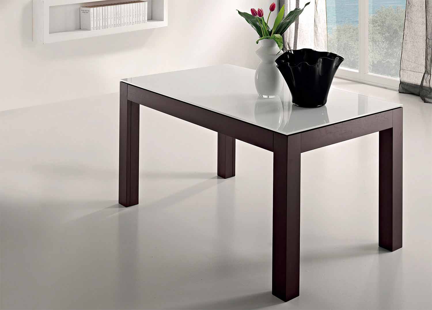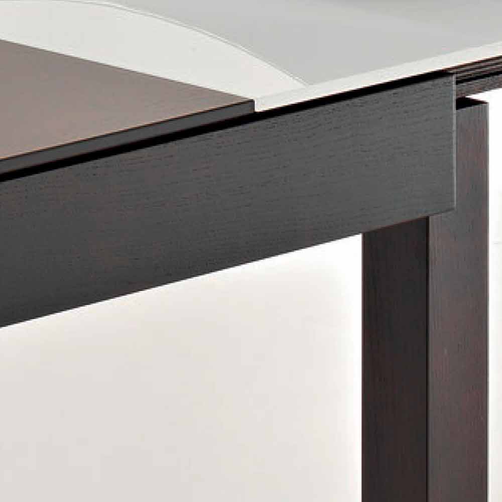 - piano in vetro extrachiaro latte, allunghe legno impiallacciato frassino finitura rovere wengè, gambe in legno massello frassino finitura rovere wengè;