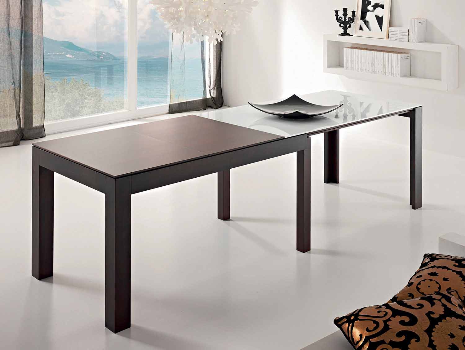 Tavolo da pranzo allungabile di design moderno con piano in vetro extrachiaro latte e base in legno di frassino, realizzato in Italia.