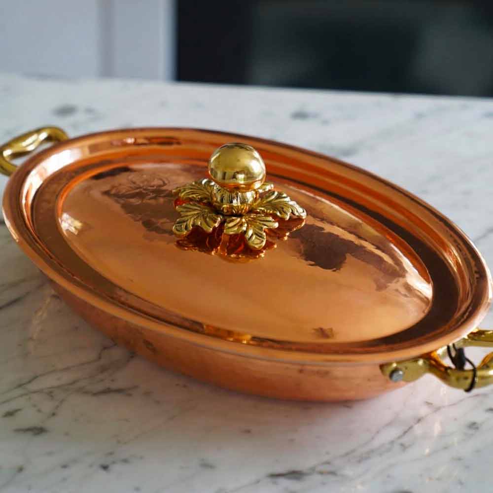 Tegame ovale con coperchio, lavorazione in rame stagnato a mano con manici in ottone made in Italy.